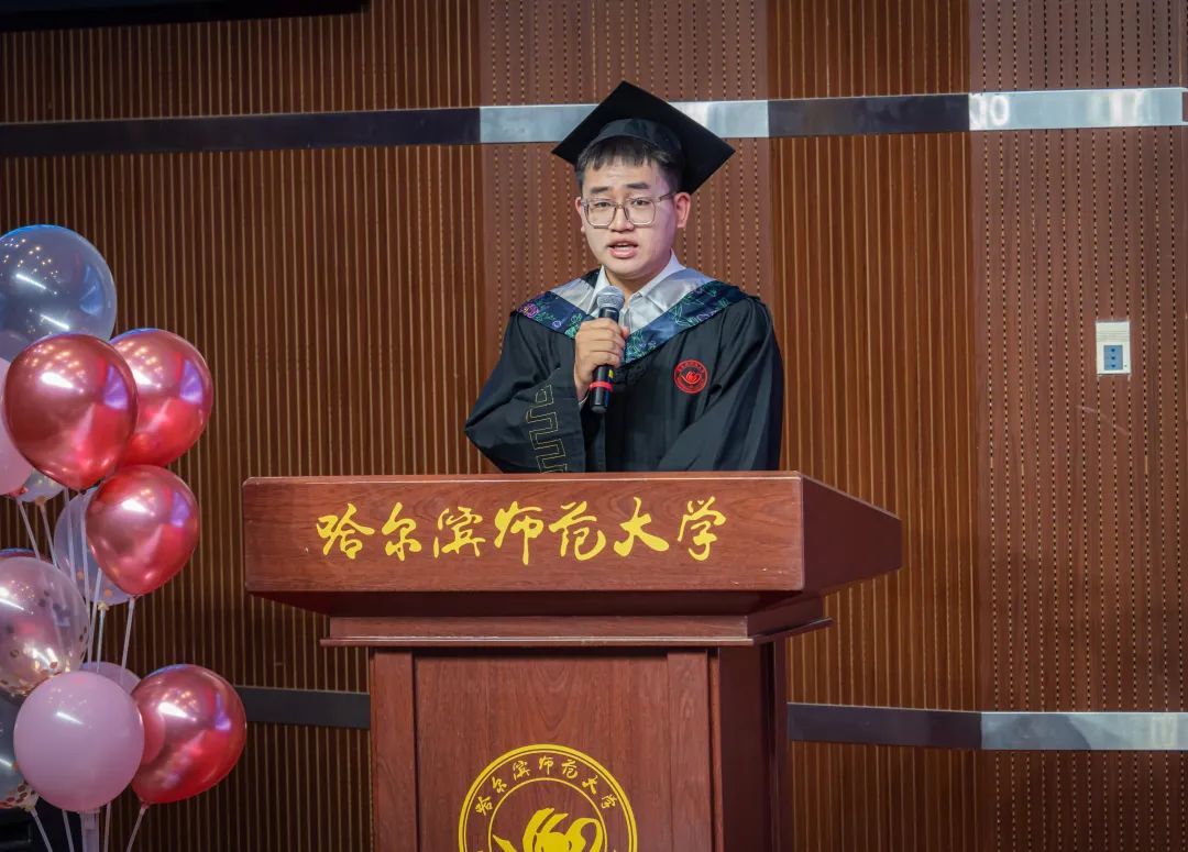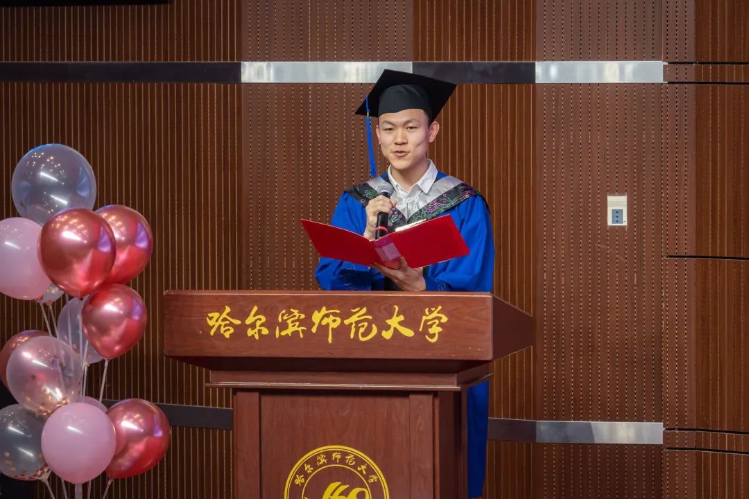 典礼第五项,本科毕业生代表兰品宽发言。他代表同学们对培育成长的母校、学院,无私奉献的恩师,风雨同舟的同伴表示衷心感谢。生逢盛世,重任在肩。站在新起点上,他将投身基层,扎根龙江,在追梦路上勇毅前行。