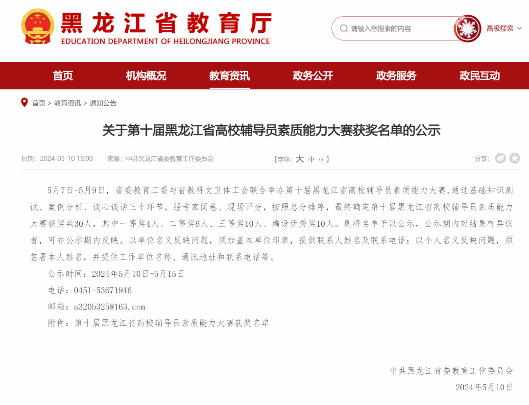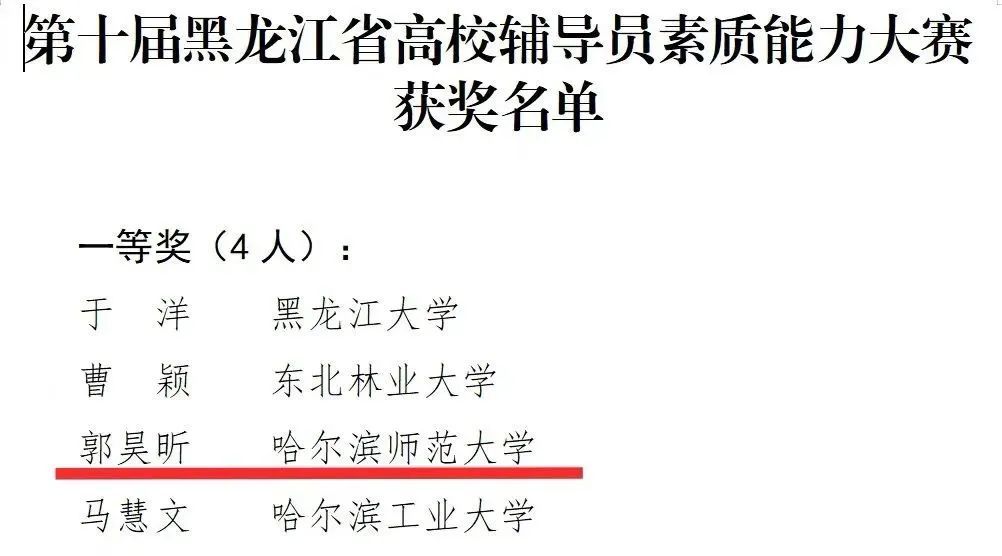 近日,省委教育工委与省教科文卫体工会联合举办第十届黑龙江省高校辅导员素质能力大赛,来自全省高校70余名辅导员参赛。通过基础知识测试、案例分析、谈心谈话三个环节的激烈角逐,最终,我院辅导员郭昊昕荣获大赛一等奖,充分展示了我院辅导员扎实的理论功底、过硬的专业素养和良好的精神风貌。