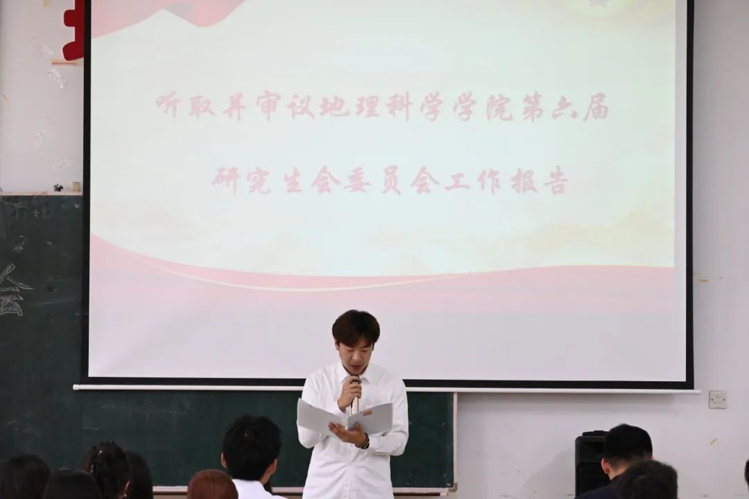 听取并审议地理科学学院第六届研究生会委员会工作报告,由第六届地理科学学院研究生会主席万缘缘汇报。万缘缘呼吁全院同学以 “功成不必在我,功成必定有我” 的担当,在科研创新中勇攀高峰,在社会实践中锤炼本领,在服务奉献中彰显价值,让青春在全面建设社会主义现代化国家的火热实践中绽放绚丽之花。