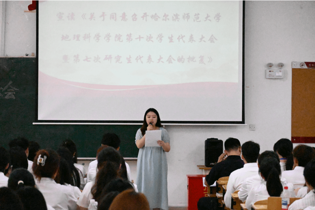 首先,由团委副书记郭昊昕宣读大会须知,2023级辅导员刘国英宣读哈尔滨师范大学学生会、研究生会《KY.COM同意召开地理科学学院第十次学生代表大会暨第七次研究生代表大会的批复》。