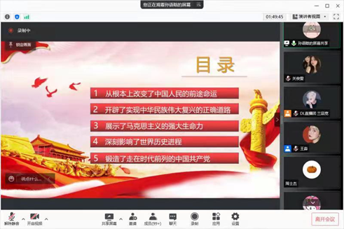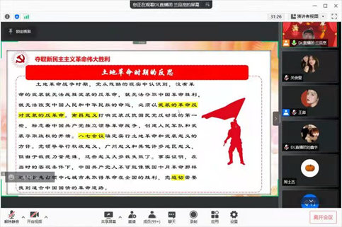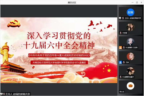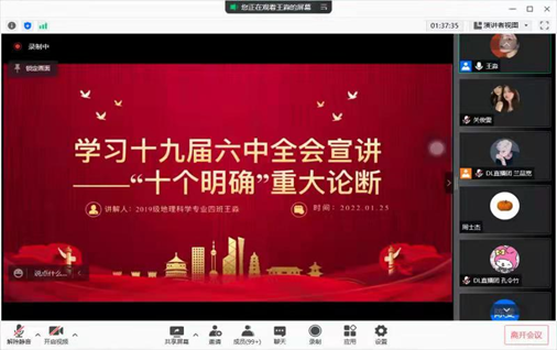 党的十九届六中全会是在中国共产党成立一百周年之际,党领导人民实现第一个百年奋斗目标、向着实现第二个百年奋斗目标迈进的重大历史关头召开的一次重要会议。为深入贯彻落实党的十九届六中全会精神,地理科学学院团委与DL直播团于2022年1月25日对其进行解读式宣讲。本次宣讲由2020级地理信息科学专业的赵瑞同学主持。