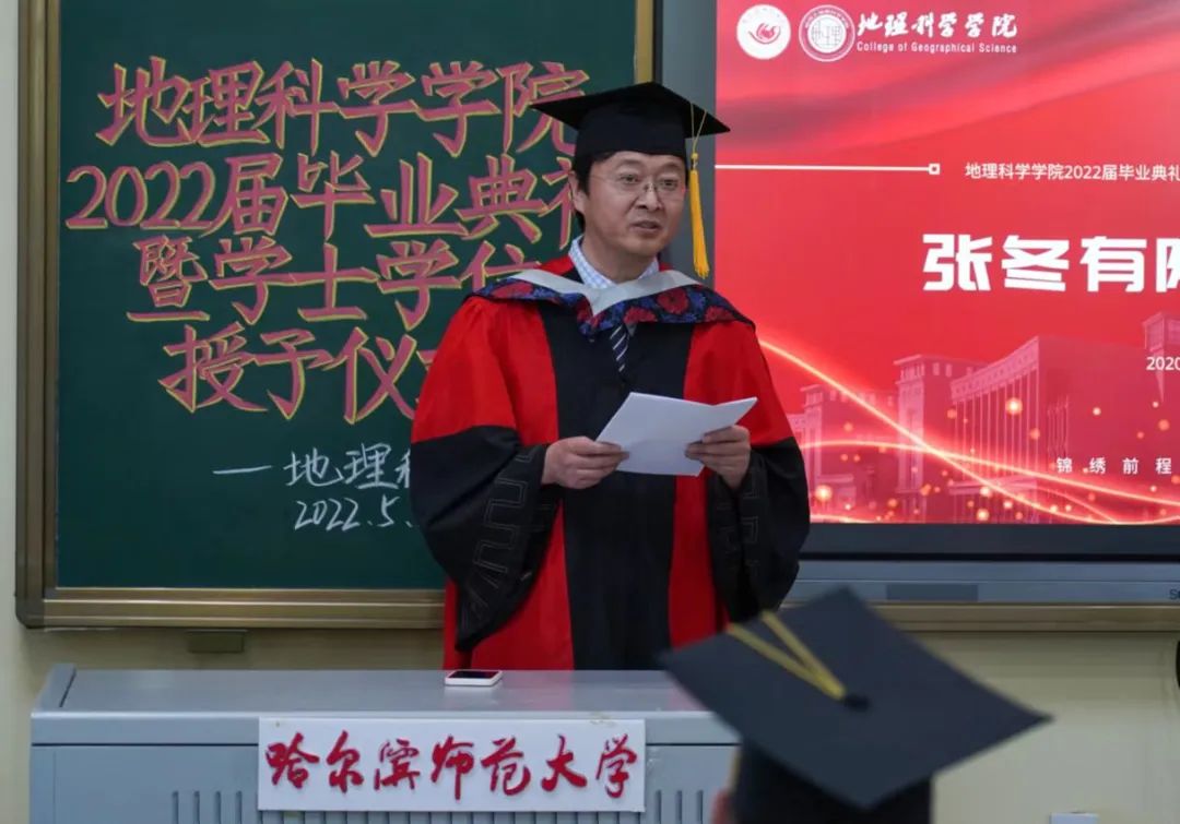 最后,地理科学学院院长张冬有为毕业生致辞。他以青春之我为主题,希望同学们在追求真理中增强青春之我的感悟力,在开拓创新中强化青春之我的创造力,拼搏进取中点燃青春之我的变革力,牢固树立终身学习的理念,拥有独立思考、分析判断、清晰表达、合作沟通、实践创新的能力,形成爱国、奉献、务实、向上、包容等优秀品质,在新赛道跑出最好成绩。