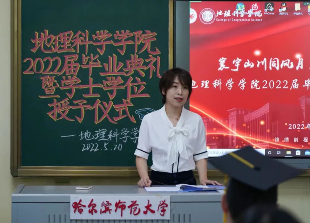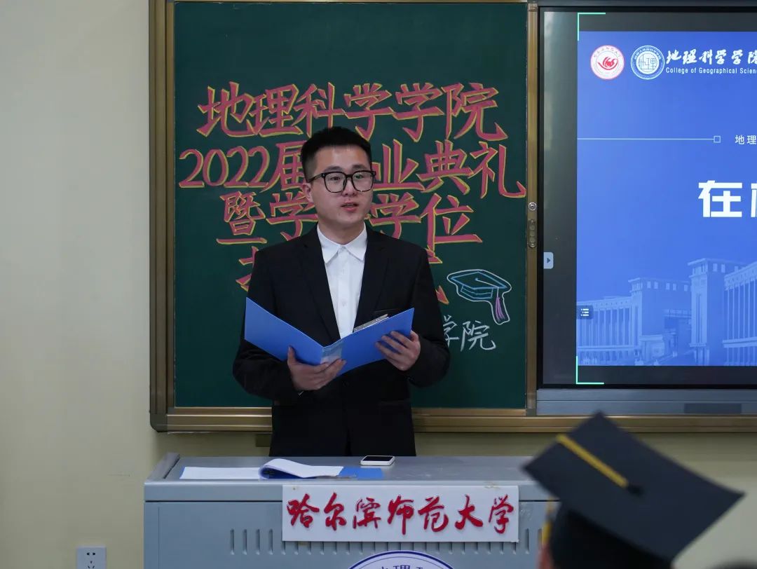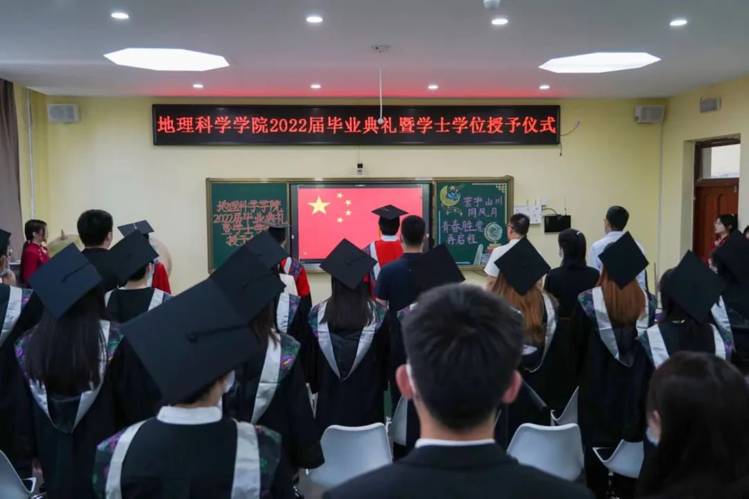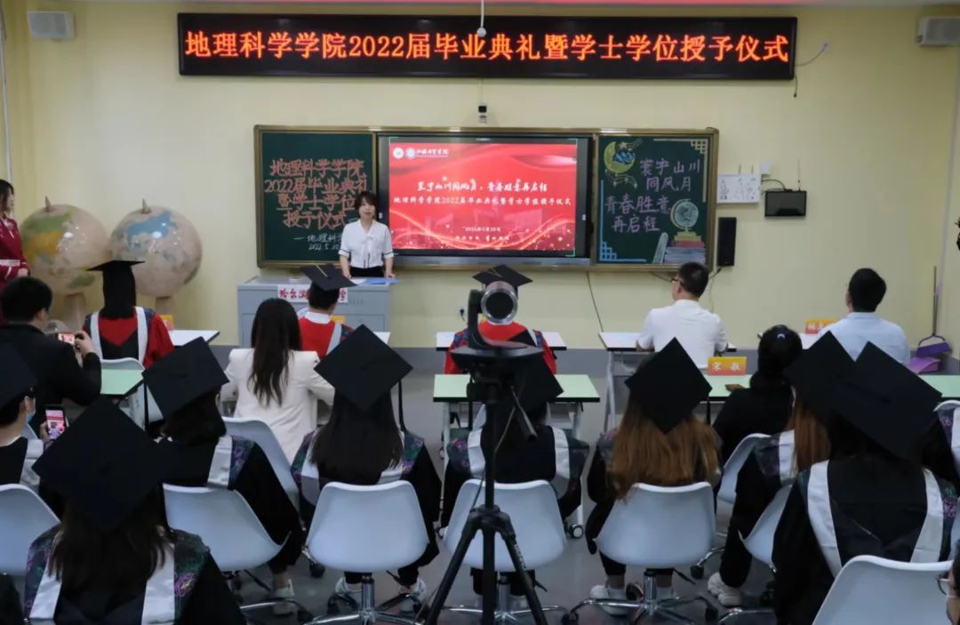 一程山水一年华,趁着风华正茂,青年以梦为马,整装待发。为贯彻落实《哈尔滨师范大学大学生思想政治教育“112349”工作模式实施方案》,做好毕业生离校服务工作,增强学生的母校情结,培育大学生家国情怀,指引毕业生树立正确的人生观,激励在校大学生既往开来,传承行知精神。KY.COM于2022年5月20日在理工三号楼215采用线上线下结合的方式隆重举行“寰宇山川同风月,青春胜意再启程”2022届毕业典礼暨学士学位授予仪式。地理科学学院党委书记蒙国军、院长张冬有、副院长吴相利、副院长李苗、正处级辅导员张立辉、全体辅导员出席本次活动,2018级辅导员陈莹莹主持本次毕业典礼,部分毕业生代表线下参加,其余全体毕业生线上观看。