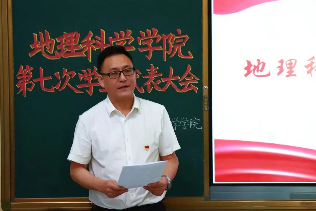 在开幕式的最后,地理科学学院党委书记蒙国军发表讲话。蒙国军书记在肯定了上一届学生会委员会工作的同时,也对全体学生代表提出了几点要求和希望:一是履职尽责,服务青年发展;二是传承红色基因,奋力成长成才;三是积极动员全校青年担负责任、完成使命,在中国共产党的领导下高举中国特色社会主义伟大旗帜,以习近平新时代中国特色社会主义思想为指导,传承先辈的伟大精神、保持优良作风,以昂扬的斗志、坚定的步履向前迈进,谨记“地在脚下,理想如花”的院训,践行“敦品励学,弘毅致远”的校训,为推动建设高水平师范院校贡献青春力量。