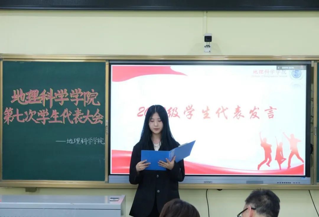 随后,2020级地理信息科学五班韩巧作为本科生代表发言。她表示学生代表大会是学院联系学生的桥梁和纽带,是学院民主管理和民主监督的重要形式,是广大同学参与自我学习、自我管理、自我服务、自我监督,进一步提高民主参与能力的重要渠道与形式。在未来的学习工作中,要树立政治意识、核心意识、大局意识、看齐意识,增强自身责任感,发挥模范带头作用。