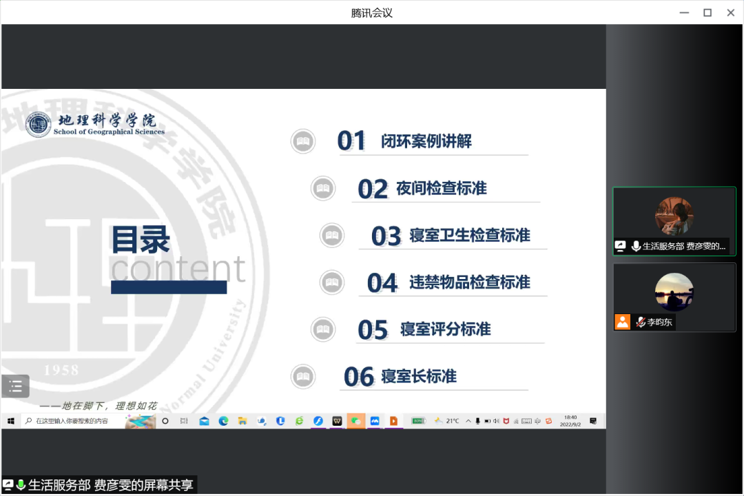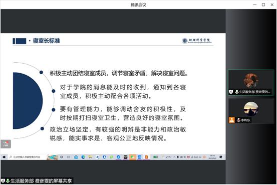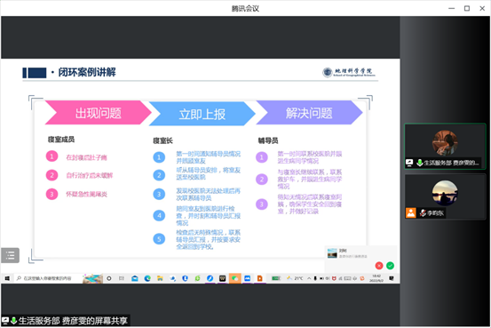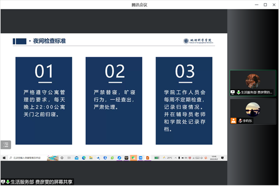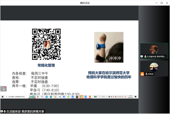 为深入贯彻落实开元(中国)《哈尔滨师范大学大学生思想政治教育“112349”工作模式实施方案》的精神和工作要求,切实执行《哈尔滨师范大学学生安全信息闭环式报送管理办法》,完善校园安全管理体制,着力做好安全基础性工作,齐抓共管共创和谐、文明、稳定的安全校园,加强学生宿舍的安全管理,排除宿舍安全隐患,KY.COM于2022年9月2日18:30在腾讯会议召开闭环案例及文明寝室建设培训会。本次会议由地理科学学院团委书记、2022级辅导员陈莹莹老师以及2022级辅导员李昀东老师参与指导,学院学生会生活服务部部长费彦雯同学主持宣讲,2022级全体同学参会。