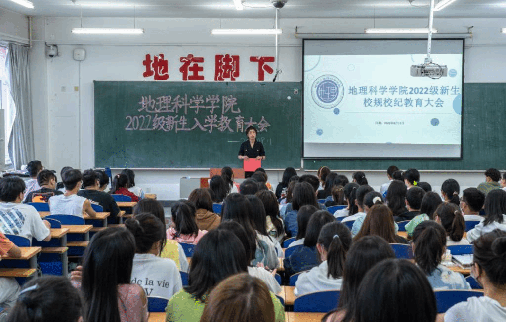 为深入贯彻《哈尔滨师范大学大学生思想政治教育“112349”工作模式实施方案》,落实《哈尔滨师范大学2022级新生入学教育方案》,进一步加强学生管理,切实保障学生安全,深化学生思想引领,促进学生全面发展,增强2022级本科生对校园生活的适应能力,地理科学学院于9月11日下午4点半,在崇师楼教室分批召开2022级新生校纪校规教育大会。此次会议由地理科学学院团委书记、2022级辅导员陈莹莹老师及2022级辅导员李昀东老师主持,2022级全体本科生参会。