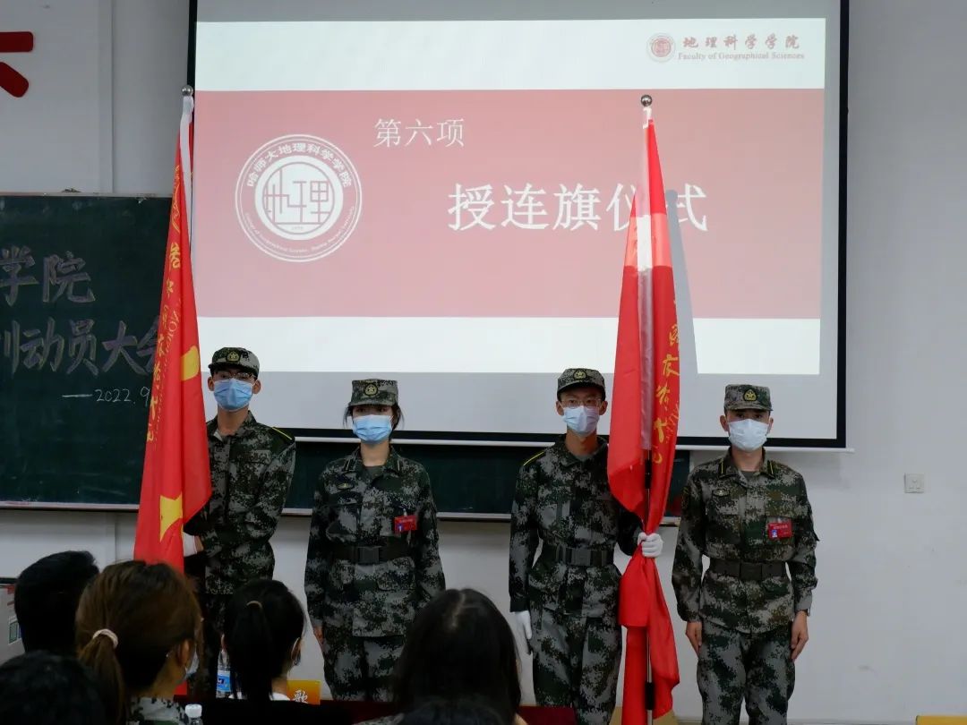 大会第六项,由教官向军训一营4个连队授旗,军训4个连队队长上台接旗。习生活中。