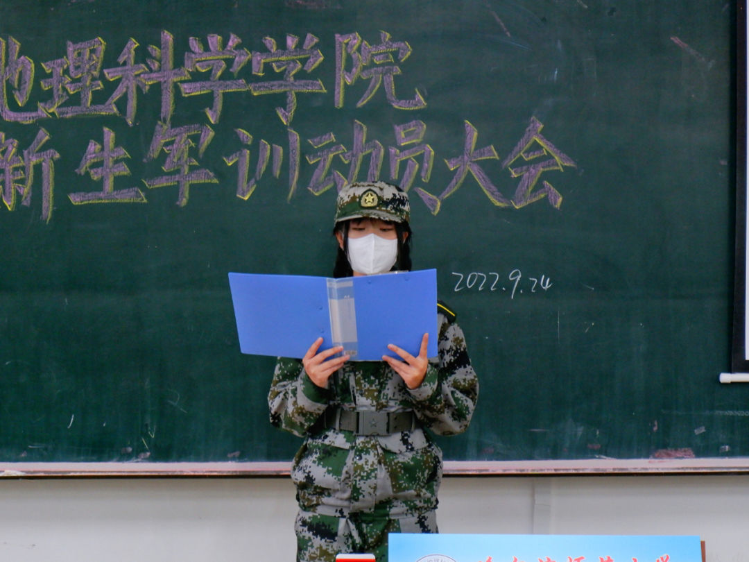 大会第四项,地理科学学院团委书记、一营指导员陈莹莹老师宣读军训期间规章制度。陈老师从内务、纪律、队列三个方面对同学们制定严格标准,要求大家在军训过程中学习了解中国国防、国家安全、军事思想等相关知识,用知识丰富头脑,用实训战胜困难。