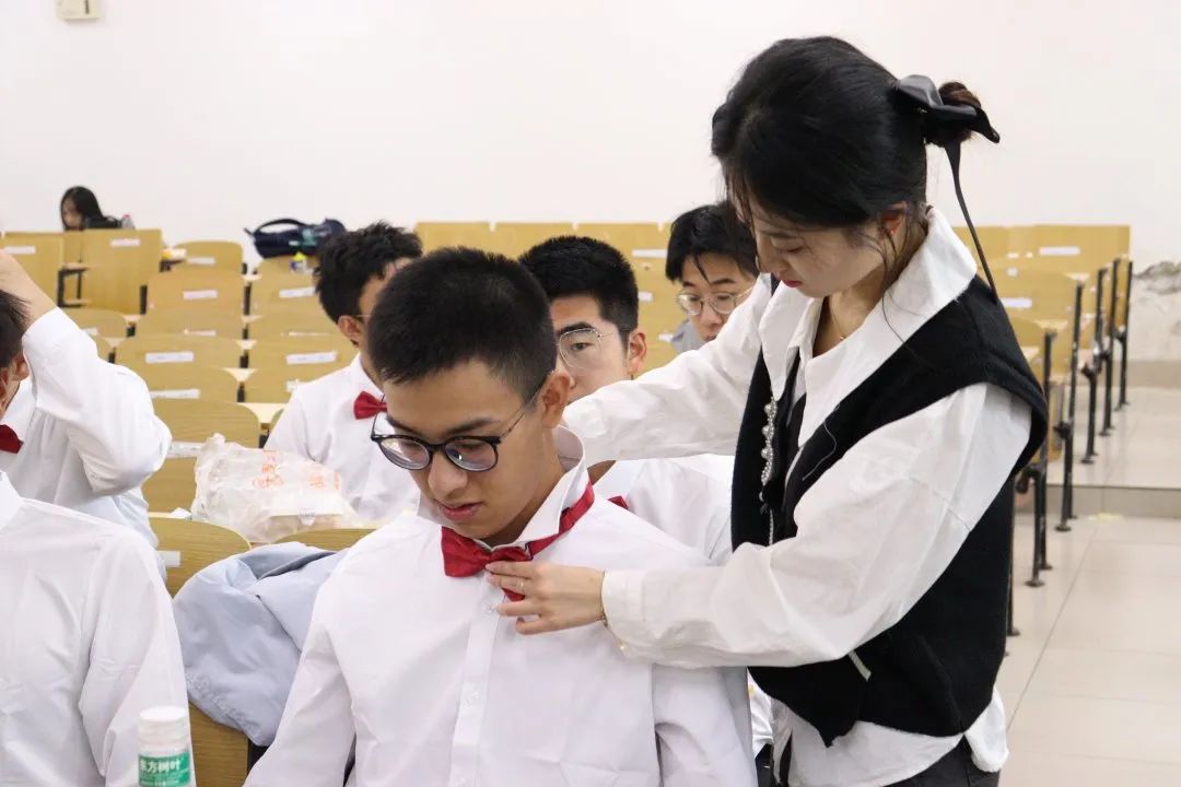 赛前,老师和学生干部们对全体合唱成员的发型妆容、服饰搭配进行了精心设计,保证大家以最佳的精神面貌迎接比赛。