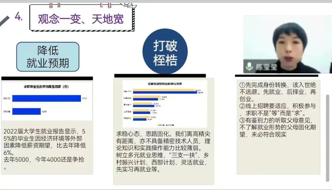 随后她以学校、学院2022届毕业生就业现状为现实依据,从数据分析、市场应用、就业性质等方面出发,把学院近两年来的毕业生就业现状,和市场分析向2023届毕业生做了深刻的阐述。