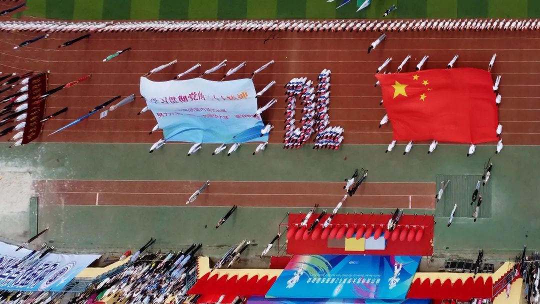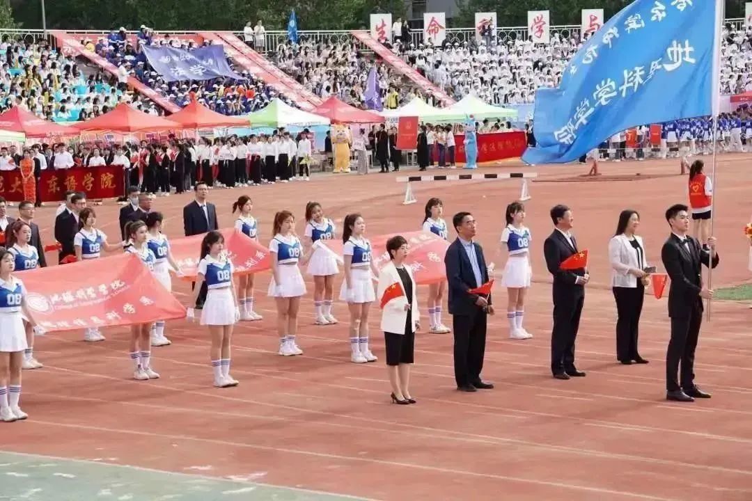 运动会开幕式上,伴随着雄壮激昂的《运动员进行曲》,由我院领导和师生组成的方阵精神饱满,喊着“地在脚下理想如花党建领航提质增效”的响亮口号阔步向前,步伐整齐、激情豪迈,认真接受大会检阅。主席台前,检阅方阵造型巧妙变换,别具一格,两面大旗美丽的画卷铺开在运动场上,展示激情澎湃的新时代篇章。