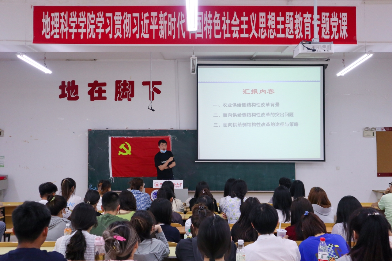 为扎实推进学习贯彻习近平新时代中国特色社会主义思想主题教育,落实“学思想、强党性、重实践、建新功”的总要求,通过地理学科专业领域与乡村振兴实际相结合,推动主题教育落实落地,全面推进乡村振兴。地理科学学院于2023年6月14日13:30在理工三220室举办学习贯彻习近平新时代中国特色社会主义思想主题教育之乡村经济振兴系列讲座——东北农业供给侧结构性改革的问题与策略。本次讲座的主讲人是地理科学学院人文地理与城乡规划系教师初楠臣,学院部分辅导员、学生党员和入党积极分子参加讲座。