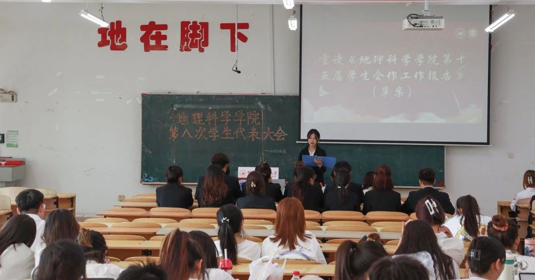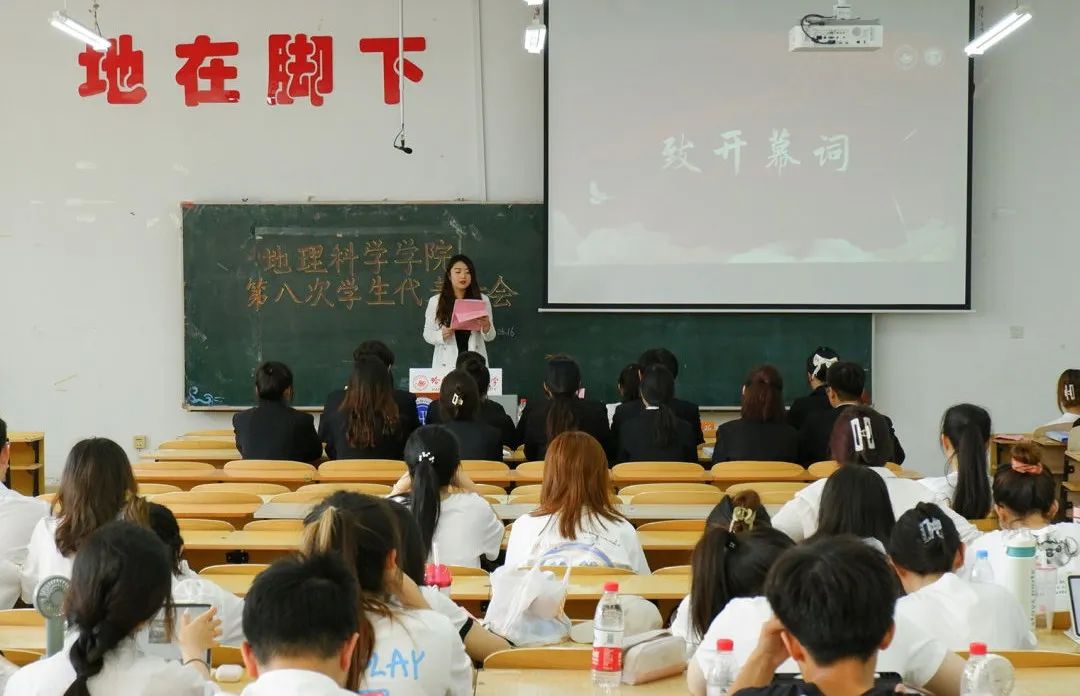 随后,地理科学学院学院第七届学生会委员会主席团执行主席韩巧向大会作《第七届地理科学学院学生会委员会工作报告》,从学生竞赛、趣味活动、教育宣讲、工作会议、社会实践等方面工作进行本年度总结汇报,同时表达了对学生干部们砥砺奋斗、再续辉煌的美好祝愿。