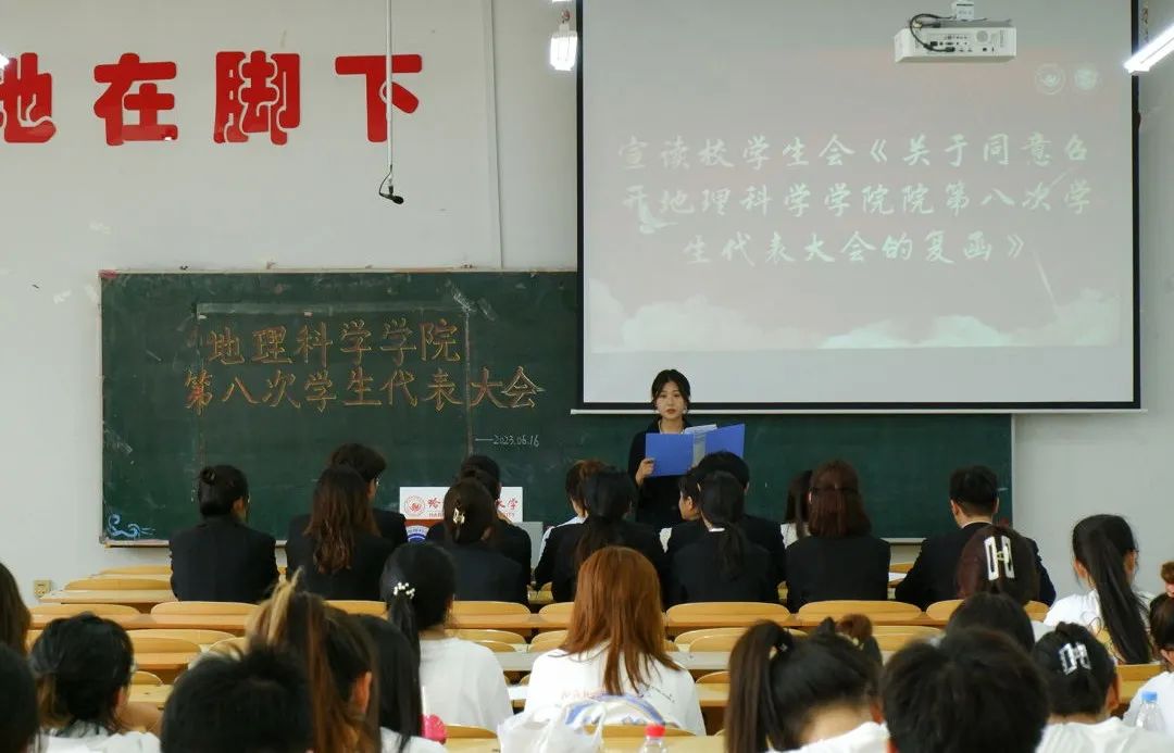 学院第七届学生会委员会主席团执行主席韩巧宣读大会须知和校学生会、校研究生会《KY.COM同意召开地理科学学院第八次学生代表大会暨第五次研究生代表大会的复函》