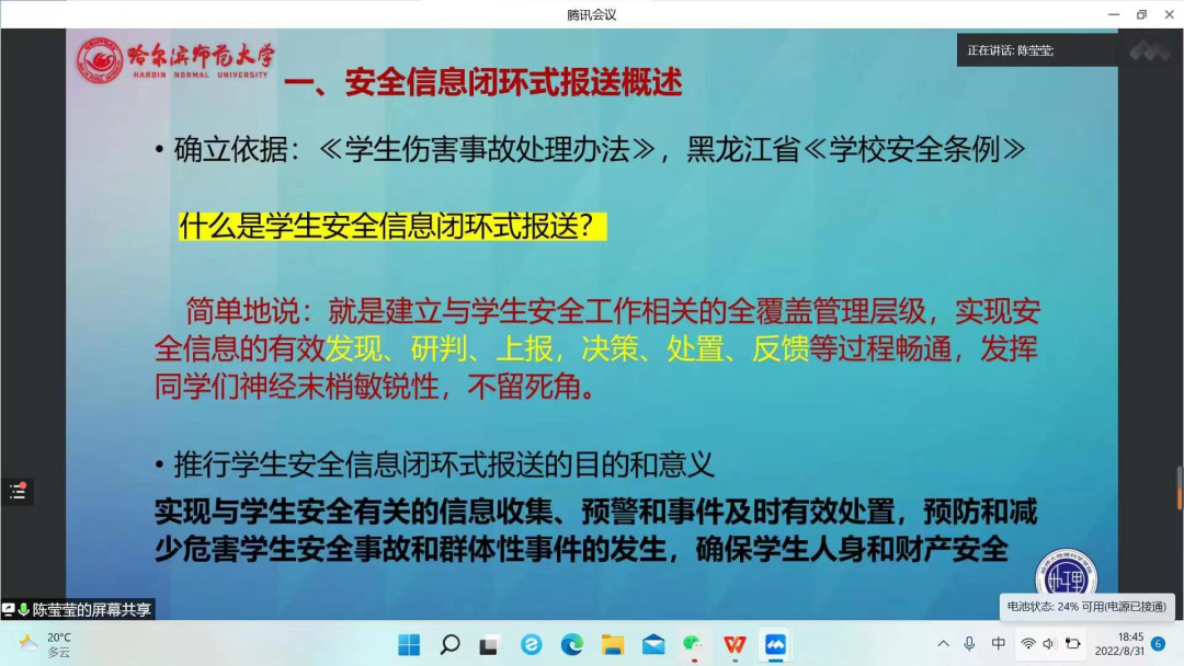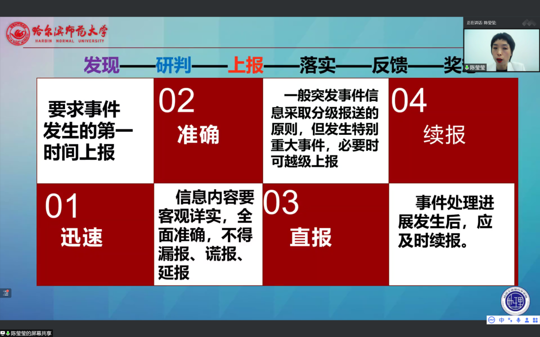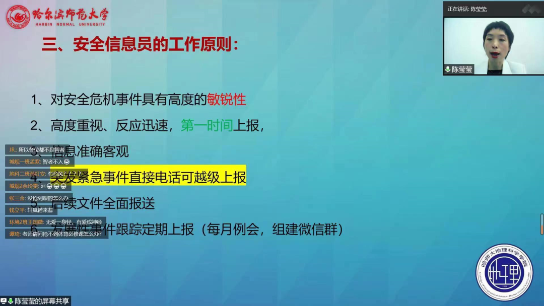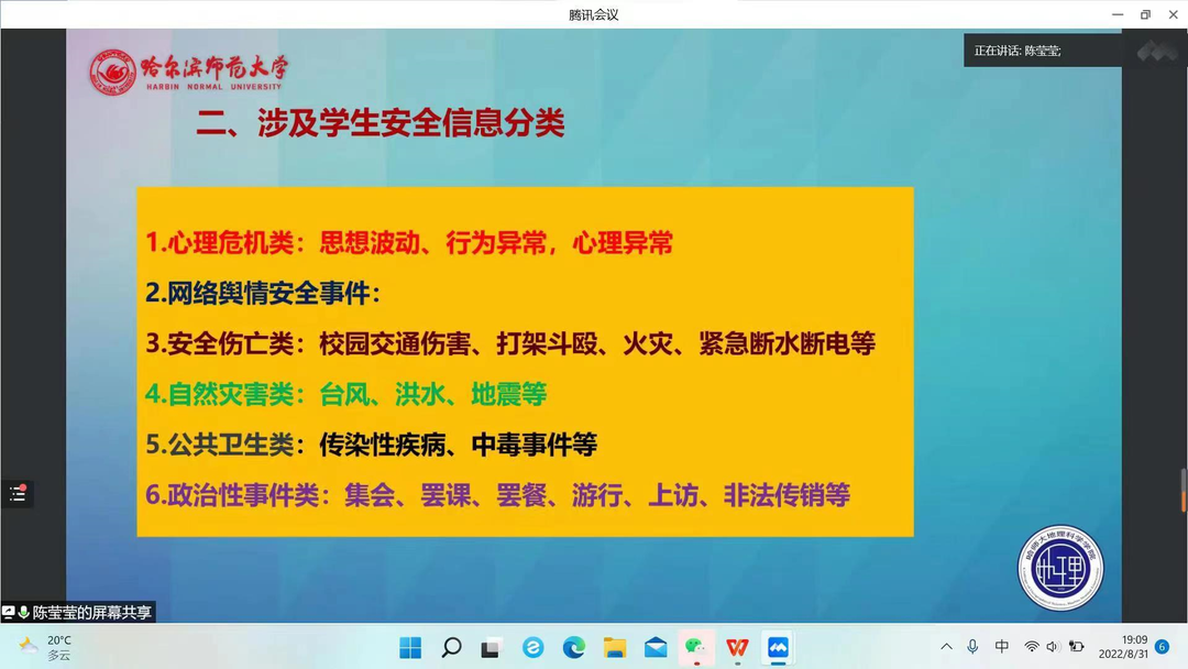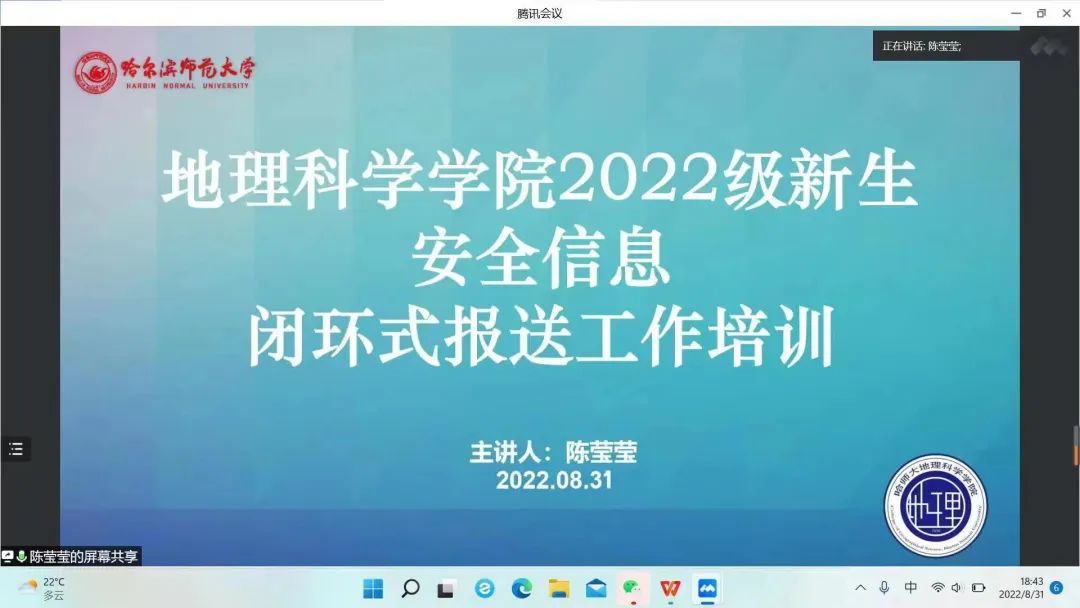 为深入贯彻落实《哈尔滨师范大学学生安全信息闭环式报送管理办法》的工作要求,创设良好的育人环境,增强新生对安全闭环式报送系统的了解,进一步提高学生的安全意识,地理科学学院于8月31日晚18:38以线上会议的形式召开2022级新生安全信息闭环式报送培训会。学院团委书记、2022级辅导员陈莹莹老师和2022级辅导员李昀东老师作为本次会议主讲人。2022级全体新生参加本次会议。