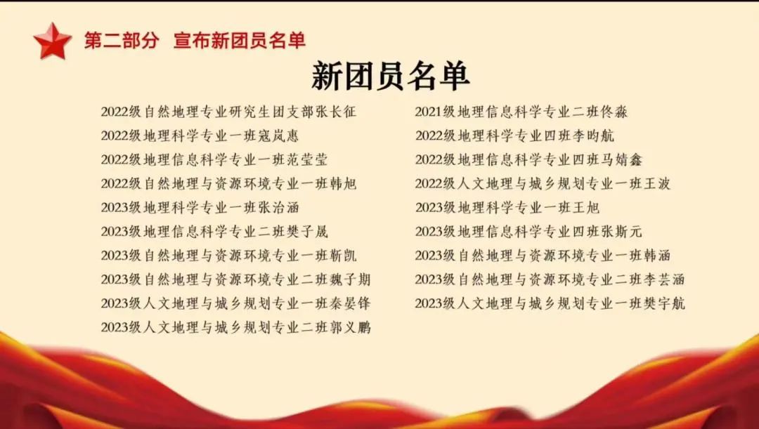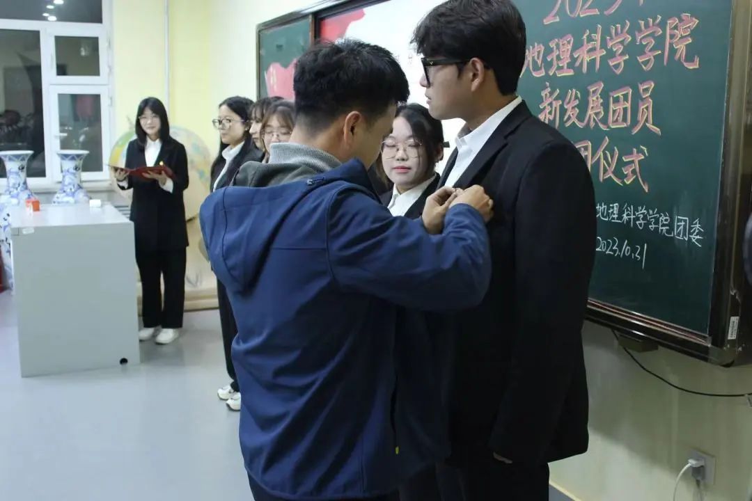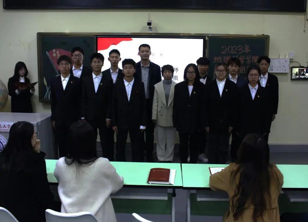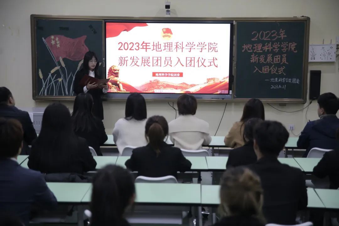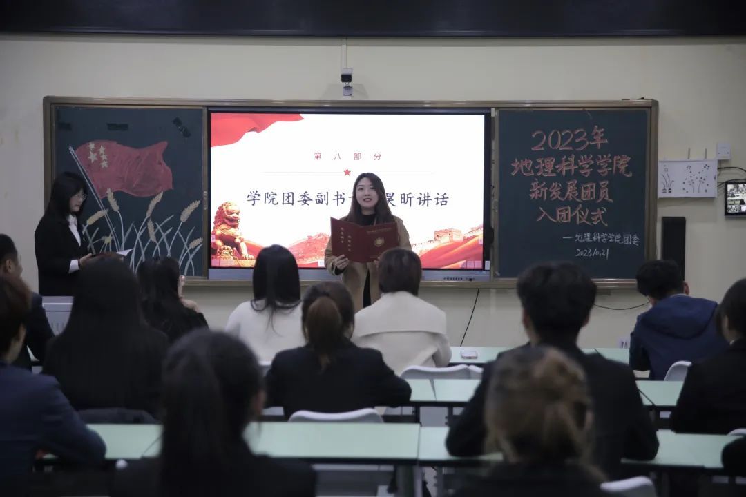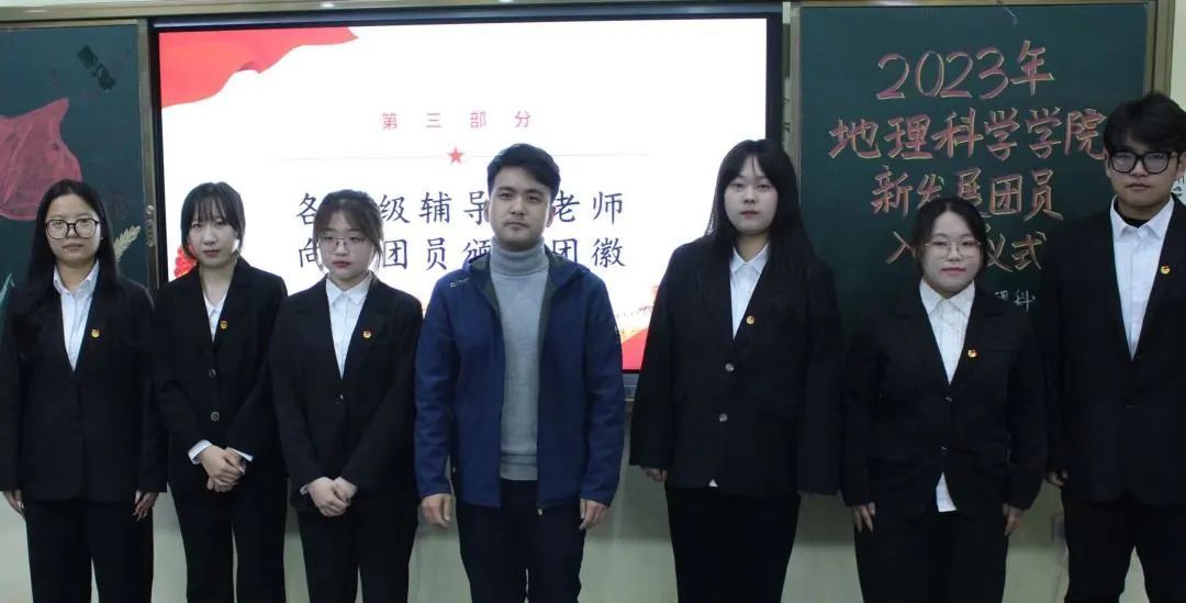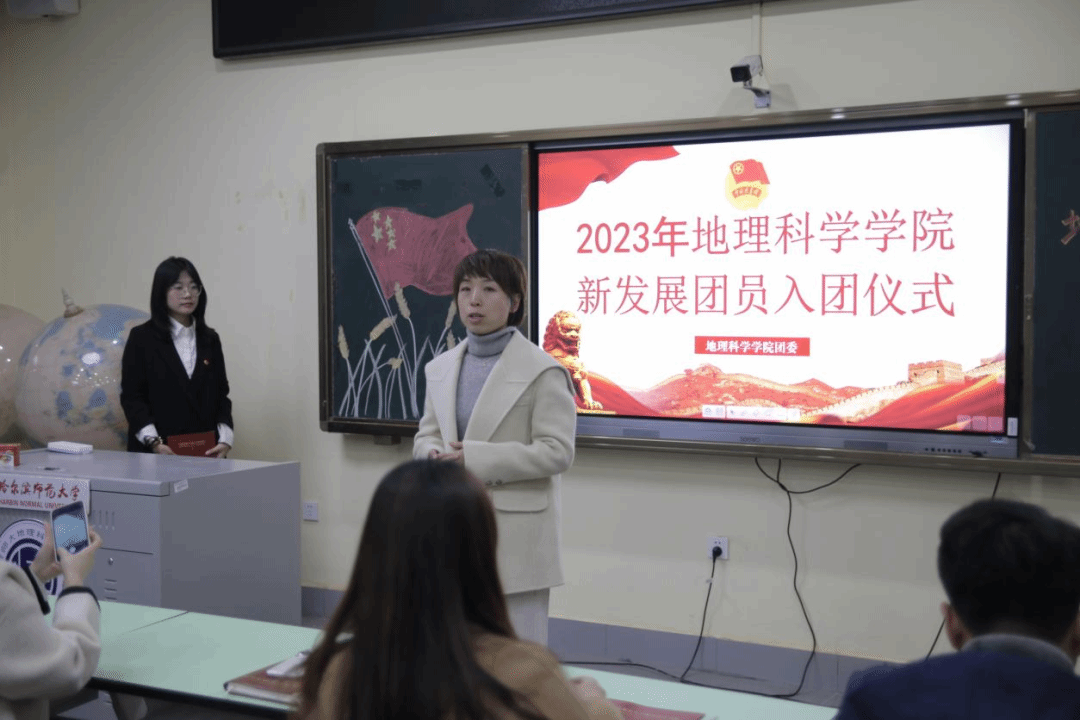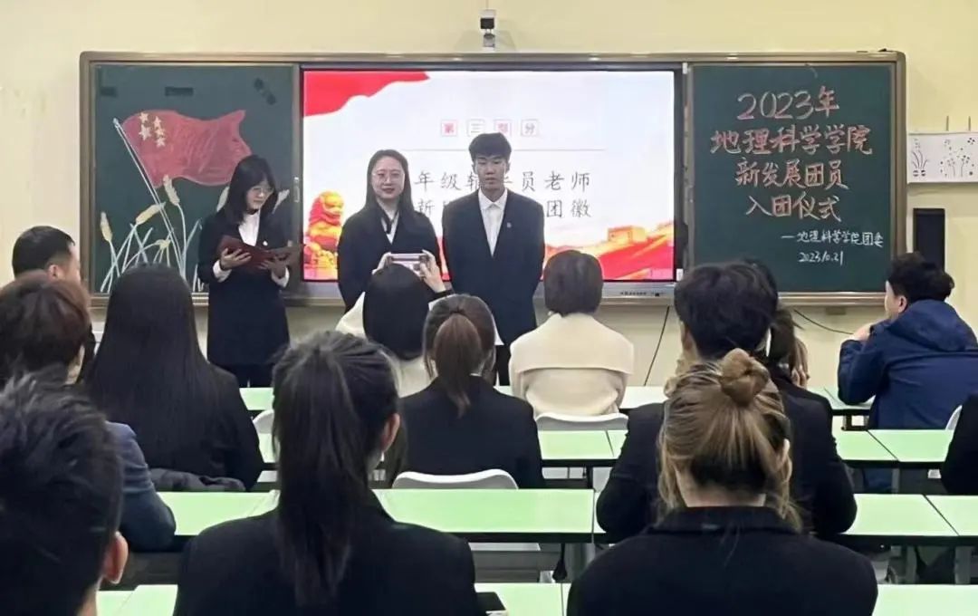 为深入学习贯彻党的二十大精神,增强团组织的凝聚力和号召力,引领青年团员坚定不移跟党走,努力建功新时代,地理科学学院团委于2023年10月31日17时在理工三215室举行2023年下半年新发展团员入团仪式,学院党委副书记陈莹莹、团委副书记、2020级辅导员郭昊昕、2022级辅导员李昀东、2021级辅导员金宇茜、2021级辅导员彭琳、2023级辅导员刘国英出席本次入团仪式,会议由学院团委组织部部长孙雨桐主持。