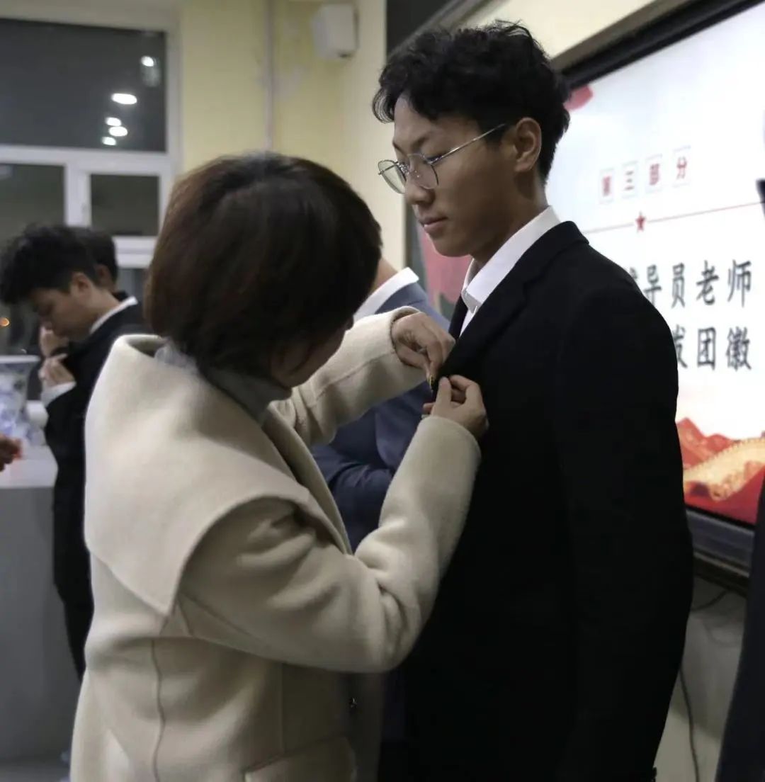 在场各位领导老师为新团员佩戴团徽,激发做一名共青团员的光荣感和责任感。