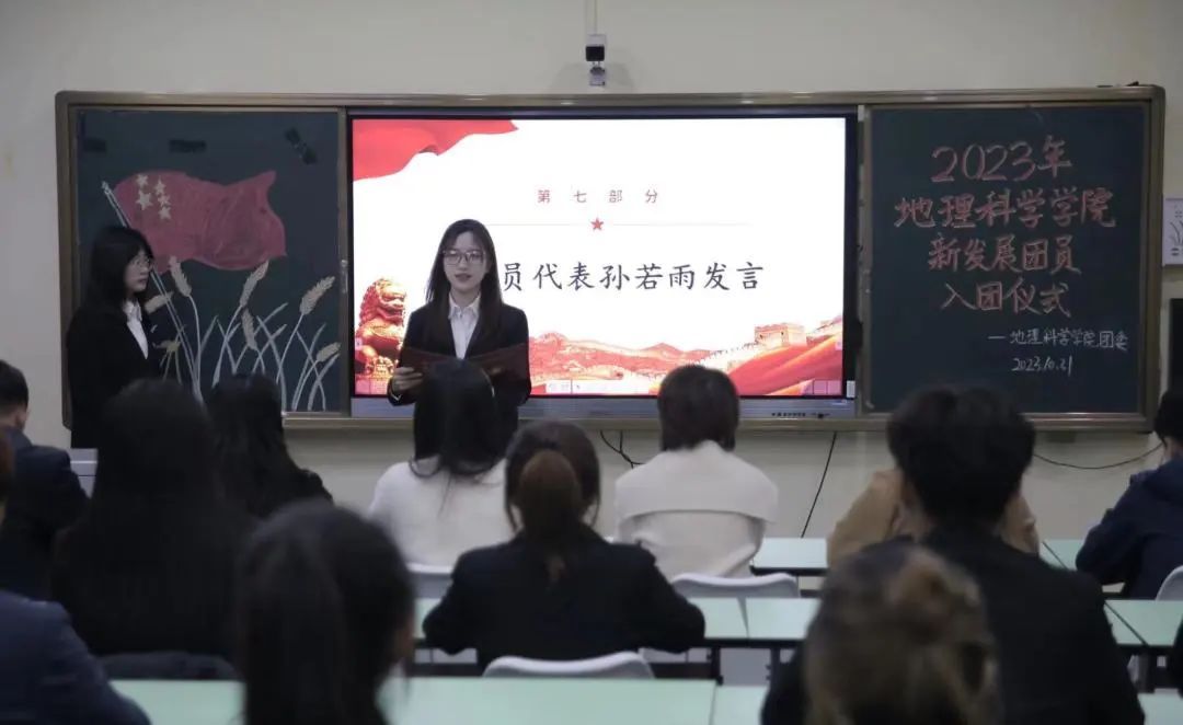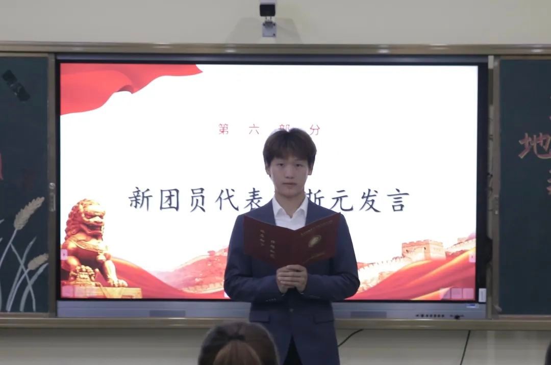2023级地理信息科学专业四班张斯元作新团员代表发言,他郑重承诺一定会践行自己的入团誓言,把铮铮誓言化作终生的信念,化作刻苦学习的毅力和恒心,努力学习,积极上进!