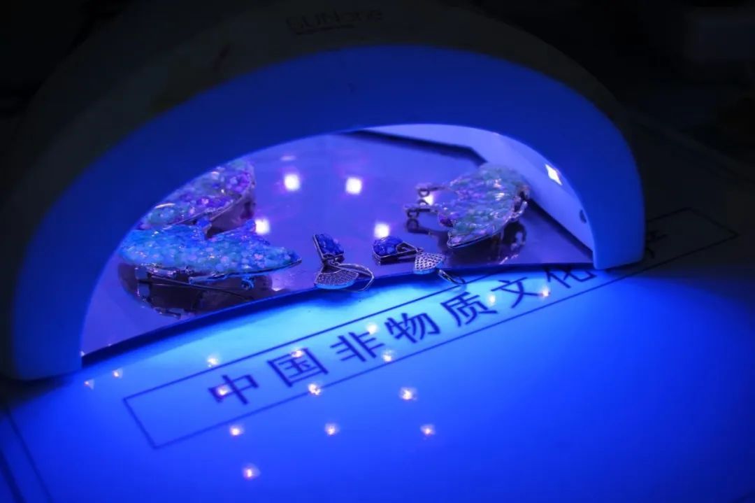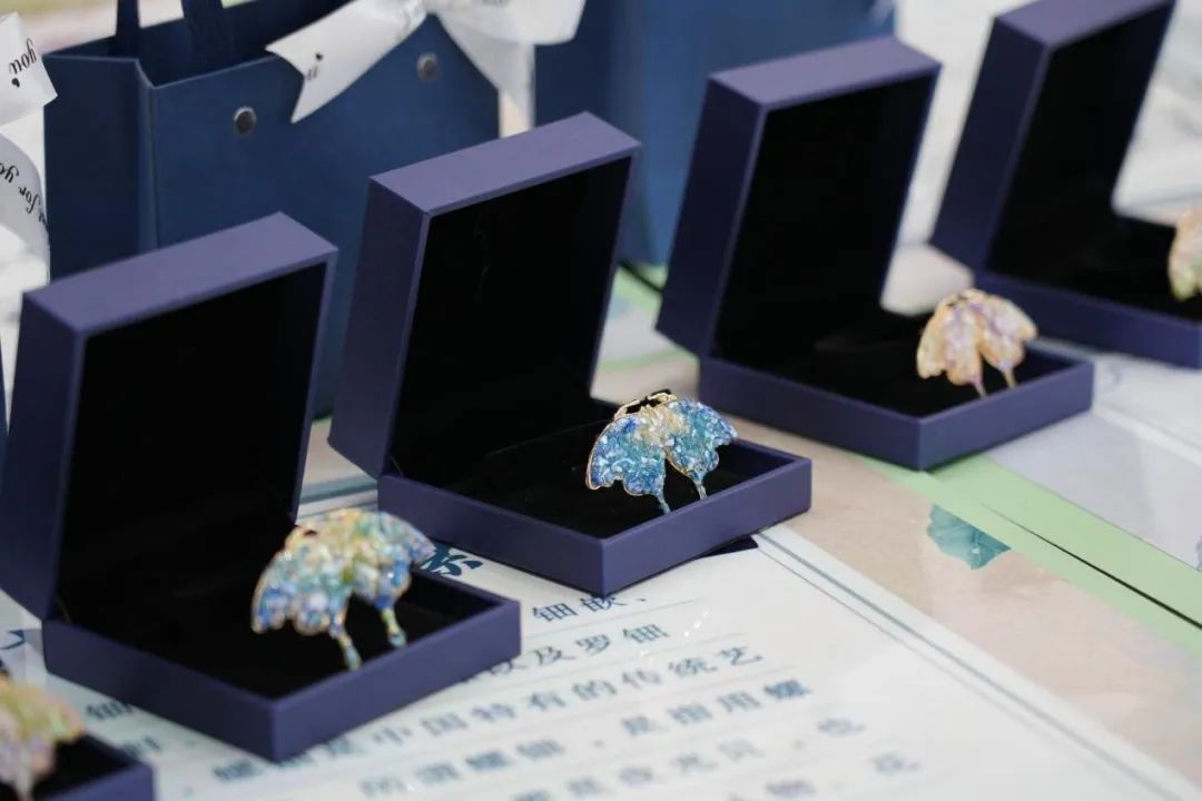在董婉莹老师及其团队的协助下,一片片色彩斑斓的螺钿片,经过挑选、打磨,巧妙地镶嵌在蝴蝶胸针之上,每一步都凝聚着女性的细致与巧思,一枚枚精美的艺术品在老师们的手中诞生。这些胸针设计独特,色彩斑斓,充满了创意和个性。