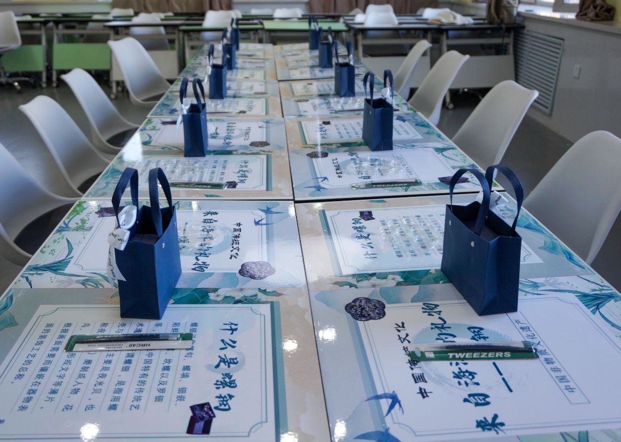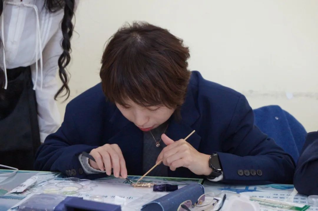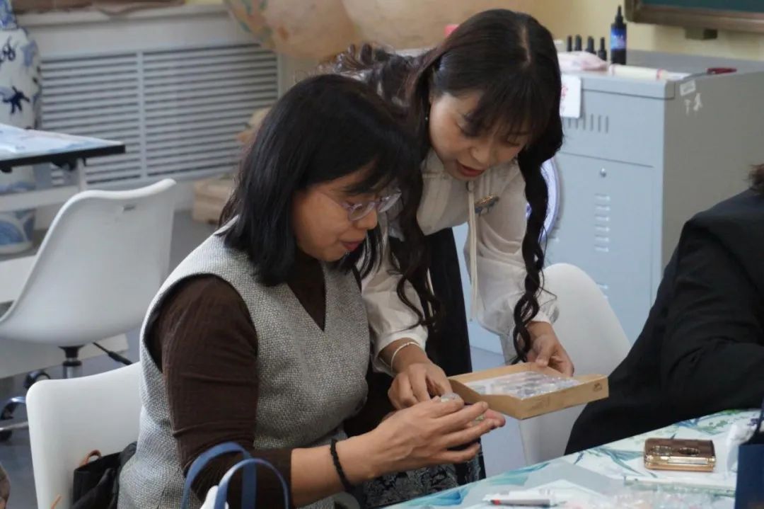 活动伊始,董婉莹老师为大家讲解了螺钿工艺的历史文化背景,并分步说明螺钿胸针制作的基本步骤和操作技巧,随后老师们满怀热情地投入到胸针的制作之中。大家全神贯注,沉浸在选材、打磨、粘贴等各个环节中,在亲手制作中感受传统文化的魅力,现场气氛轻松愉悦。