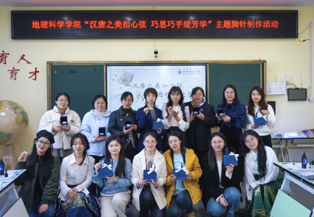 为深入学习贯彻习近平新时代中国特色社会主义思想和党的二十大精神,认真落实中国工会十八大精神,丰富学院女教职工课余文化生活,引领女教职工热爱生活、陶冶情操,体验中华传统工艺的魅力,3月25日,地理科学学院工会在理工三号楼215室举办“汉唐之美扣心弦,巧思巧手绽芳华”主题螺钿胸针制作活动。本次活动特别邀请教育科学学院学工办副主任董婉莹担任主讲嘉宾,学院党委副书记陈莹莹、副院长周嘉、副院长张玉红及学院女教职工代表参加本次活动。