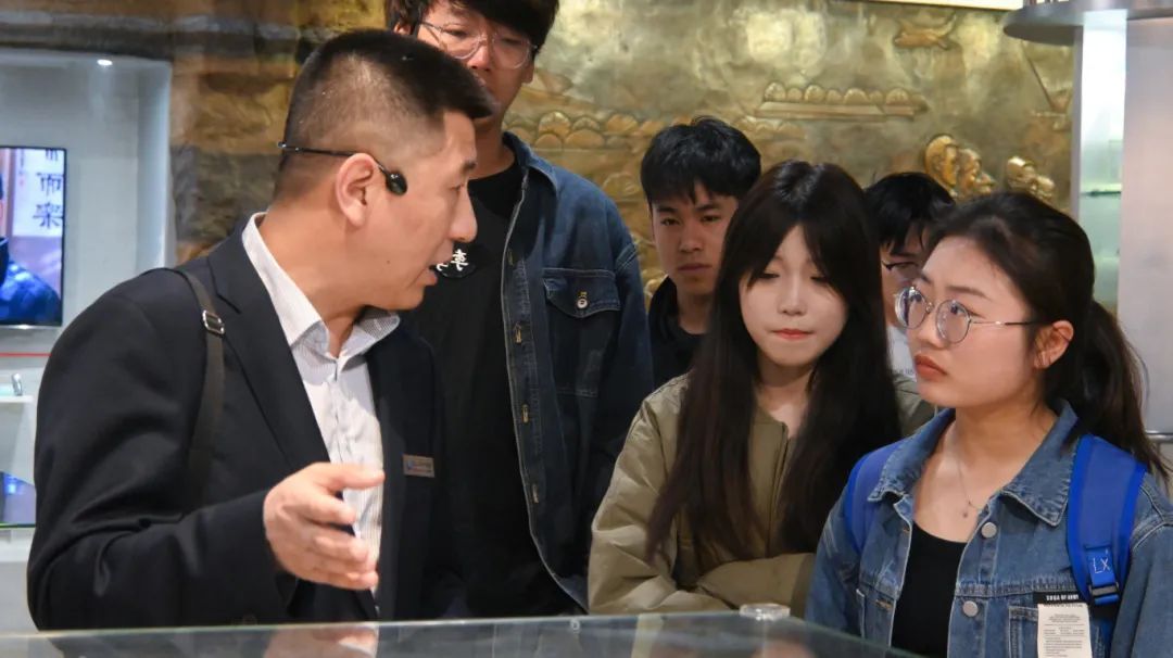 展厅采用玻璃通透式的展柜和镶嵌墙体上的晶洞,为参观者展现黑龙江省多姿多彩的岩石和矿物以及传承古代文明的四大观赏石和四大名砚。讲解员通过与同学们一问一答的讲解方式,幽默风趣地介绍了有关岩石矿物的知识。