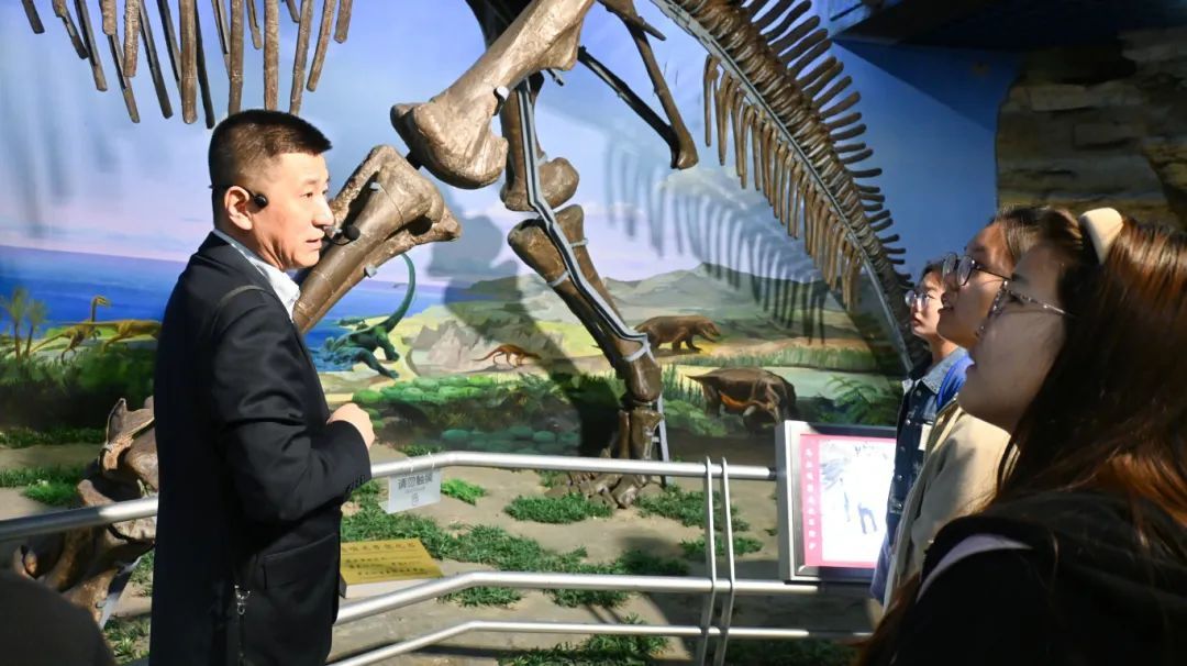 在地层古生物厅和恐龙动物群厅,同学们仿佛走进课本,近距离观察各式各样动植物的化石。讲解员依次介绍了猛犸象化石、披毛犀、东北野牛化石,以及部分牙齿骨骼等, 全面系统地向同学们介绍了在地质历史时期恐龙的兴衰史。