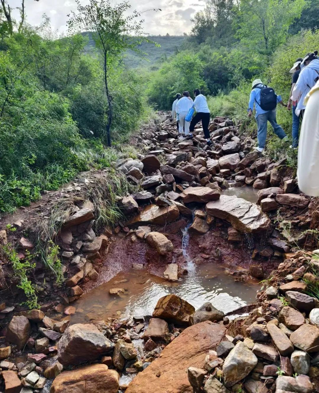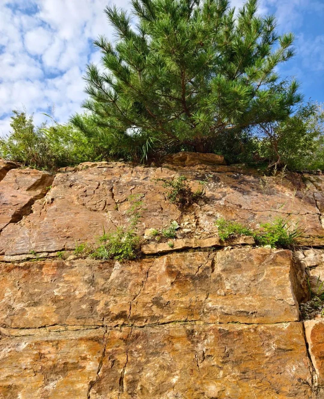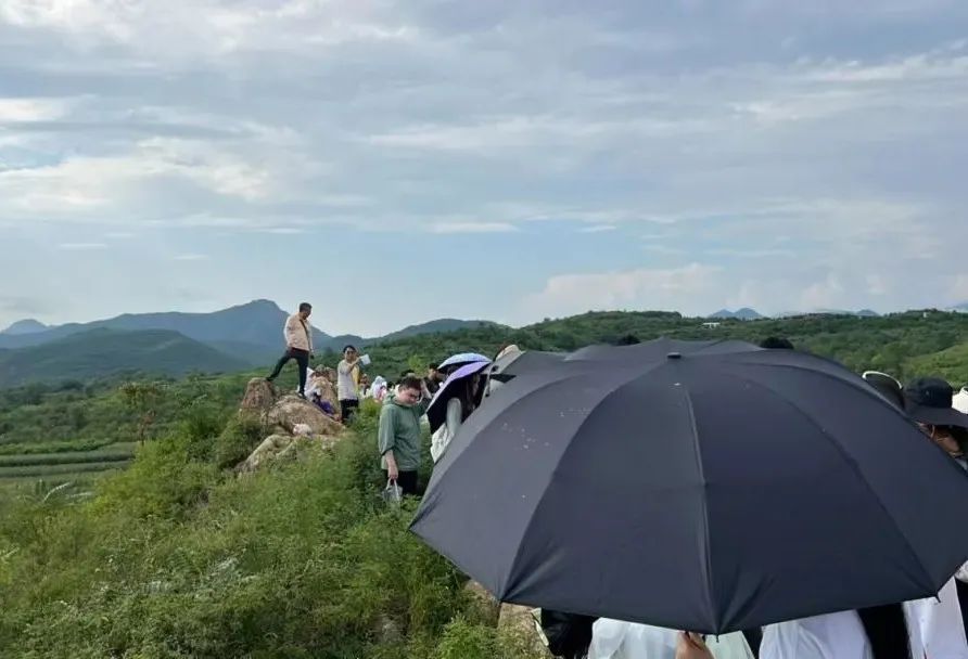 8月23日清晨,天边刚泛起鱼肚白,我们迎着清晨的第一缕阳光,满怀热情,乘坐大巴前往鸡冠山。随着大巴缓缓驶出基地,窗外是逐渐远去的城市轮廓,取而代之的是郁郁葱葱的树林与窸窸窣窣的虫鸣声。满怀期待与兴奋,我们到达鸡冠山北麓。由于昨天的降雨,山路流水淙淙,我们沿着冲沟,脚踩碎石,一路向上。经过了两个多小时的跋涉,我们终于到达了山顶,欣喜、疲惫之余大家纷纷合影留念。一路上,我们学会了在野外识别平移断层、正断层,见证了25亿年前的变质花岗岩与9.3亿年前石英砂岩的沉积间断,通过羽状交错层理、浪成波浪、海绿石等证据明确了浅海相的沉积环境,重温了岩层产状的测量方法。书本上的知识映入眼帘,同学们感叹地层的多样,自然的鬼斧神工,坚定了保护环境的信心。