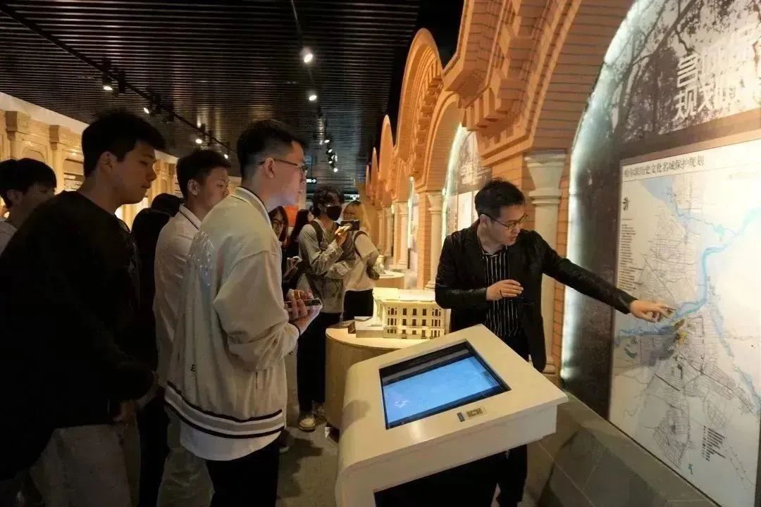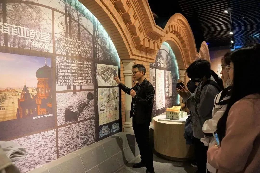 位于展馆一层的是城市历史展区,展示了印象哈尔滨、城市溯源等内容。崔禹老师介绍了哈尔滨城市建设及规划的发展历史,期间穿插介绍了哈尔滨现存古老建筑哈尔滨文庙、极乐寺与西方古典式建筑及造型奇特的东正教、天主教、基督教的教堂等建筑风格,专业性极强,使同学们对哈尔滨的城市发展足迹有了初步了解。