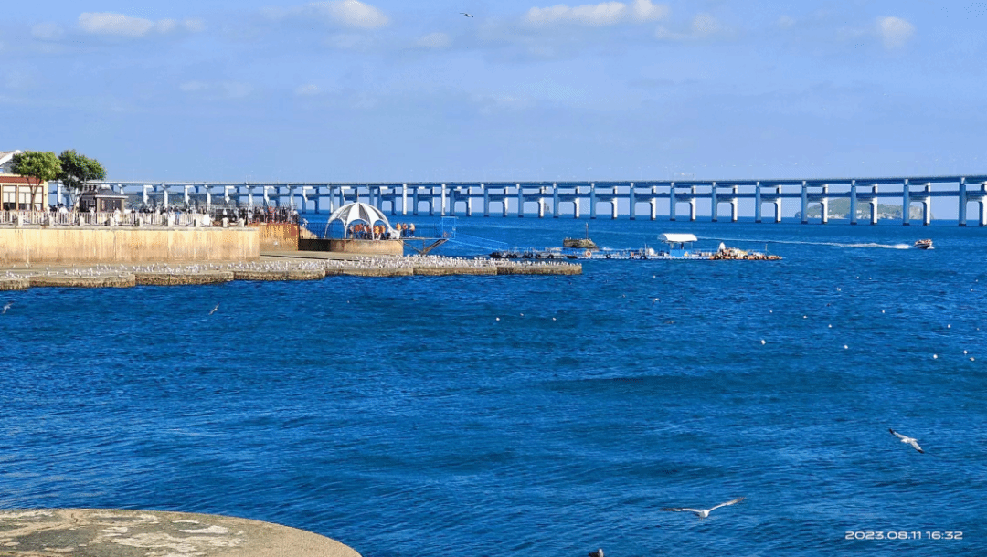 在辽东半岛最南端观景台上,李剑锋老师讲解了黄渤海分界线的成因,由于海水盐度的差异,远处的黄海呈现深色,近处的渤海呈现浅色。