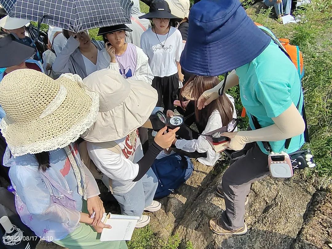 到达山顶后,同学们使用地质罗盘测量山顶岩层产状;并在鸡冠山滑动断层处观察到断层镜面、擦痕以及阶步,运用所学知识判断出断层性质与断层运动方向;此外,还观察到形成于9.3亿年前形成的长龙山组石英砂岩及其与25亿年前形成的新太古代变质花岗岩不整合沉积接触关系。