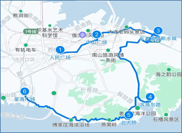 大连市区线路如图L1-1所示,大连市规划展示中心—人民广场—中山广场—东港商务区—滨海大道—北大桥—星海广场。