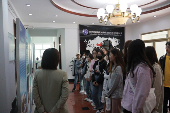 讲解员带领大家了解园内的黑龙江省海天地理信息技术股份有限公司,海天公司成立于2004年6月隶属于黑龙江测绘地理信息局,公司成立至今始终保持与国际地理信息测绘公司的合作关系,是目前国内规模较大的国际地理信息数据加工服务外包生产基地之一。近年来我国地理信息产业蓬勃发展,卫星遥感市场空间广阔,随着GIS技术的不断网络化,地理信息系统的需求在不断扩展,人才需求量大大增加,同学们深受鼓舞对未来从业环境满怀期待。