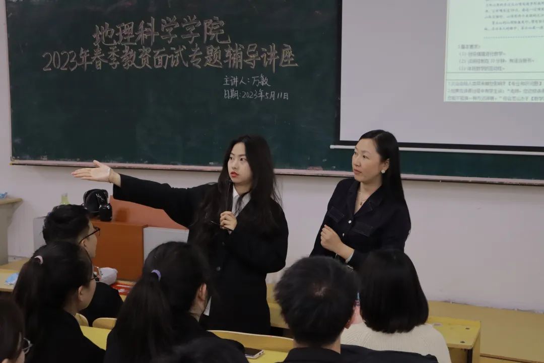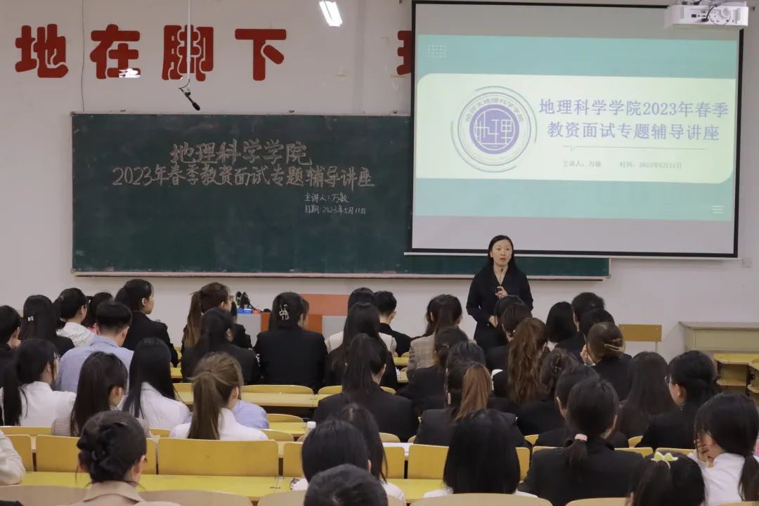 为提升我院学生教资面试的应考能力,帮助学生掌握更加丰富、实用的教资面试技巧,结合学校主题教育工作要求,地理科学学院特邀请万敏副教授,于5月11日在理工三122室开展2023年春季教资面试专题辅导讲座。本次讲座由地理科学学院副院长周嘉主持,我院53名本科生、34名研究生参加。