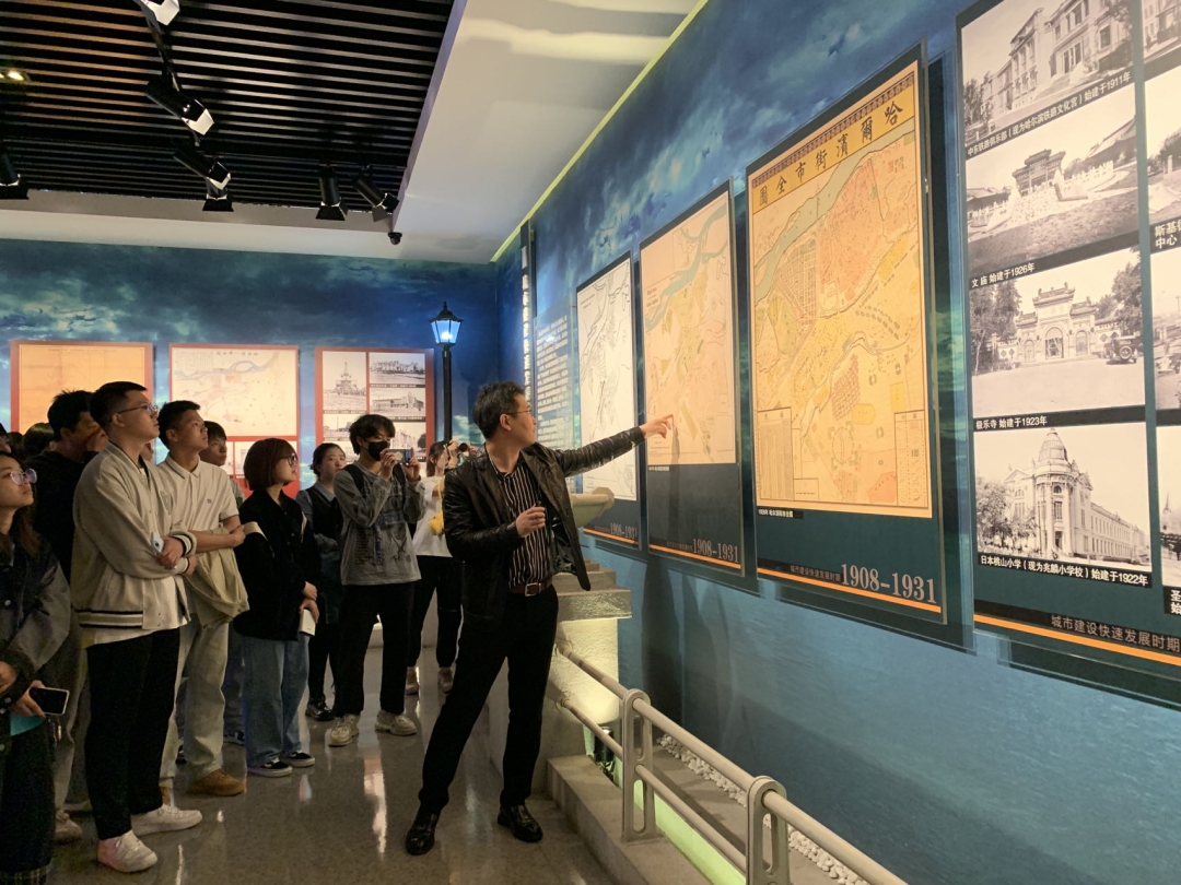 位于展馆一层的是城市历史展区,展示了印象哈尔滨、城市溯源等内容。崔禹老师介绍了哈尔滨城市建设及规划的发展历史,期间穿插介绍了哈尔滨现存古老建筑哈尔滨文庙、极乐寺与西方古典式建筑及造型奇特的东正教、天主教、基督教的教堂等建筑风格,专业性极强,使同学们对哈尔滨的城市发展足迹有了初步了解。
