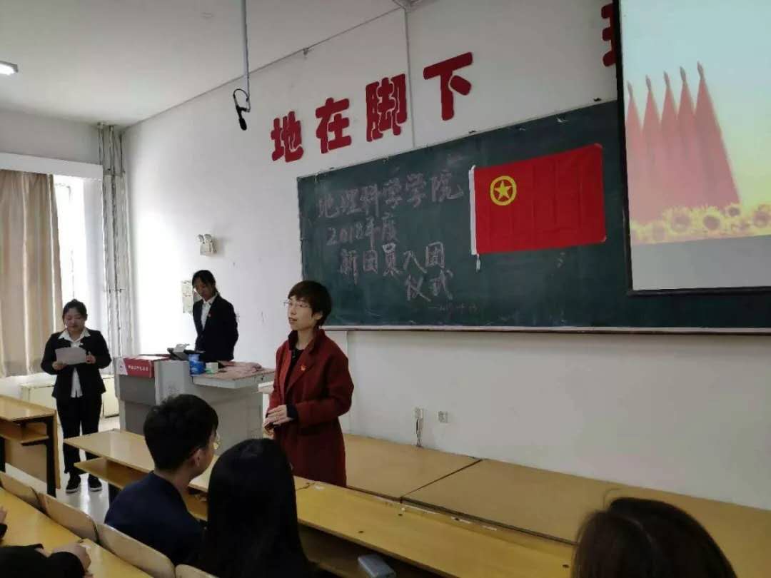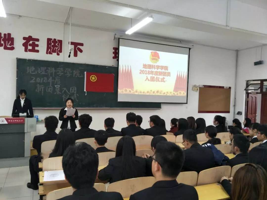 为贯彻落实《哈尔滨师范大学大学生思想政治教育“112349"工作模式实施方案》,加强学生团员理想信念教育,进一步推进团务建设,充实我院团员队伍,为学院团组织输入新鲜的血液,注入新的活力,引导学生团员积极践行社会主义核心价值观,使广大团员牢记团员责任和义务,地理科学学院于4月3日下午,在理工三122顺利举行2018年度新团员入团仪式。出席本次会议的有地理科学学院团委书记陈莹莹老师,学生团委书记吴海银、学生团委副书记门志远、周思雨、全体团干部以及新发展团员。