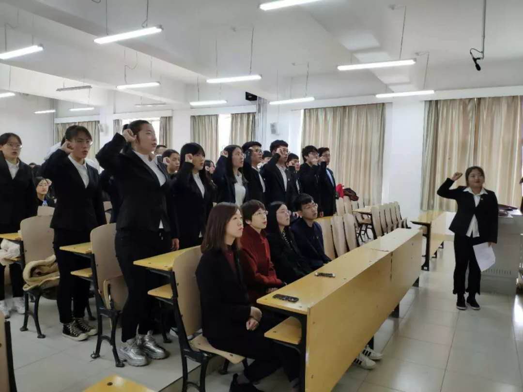 本次会议共分七项,会议在庄严肃穆的国歌声中拉开帷幕,本次入团仪式由学生团委团建部宁佳雯主持,我院20名新发展团员光荣加入了中国共产主义青年团,成为了中国共产党忠实的后备力量。奏唱国歌结束后,由学生团委团建部副部长董倩宣布入团名单,随后由陈莹莹老师为新团员代表佩戴团徽。佩戴在团员左胸前的团徽,是一个代表共青团的徽章,它不是一个普通的装饰品,也不是一般的纪念章,而是共青团员肩负重任的标志。会议第四项,由宁佳雯同学带领20名新团员们在团旗下庄严宣誓,表明自己的决心,牢记团的誓言。