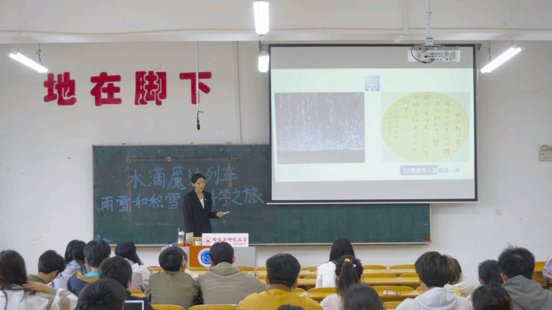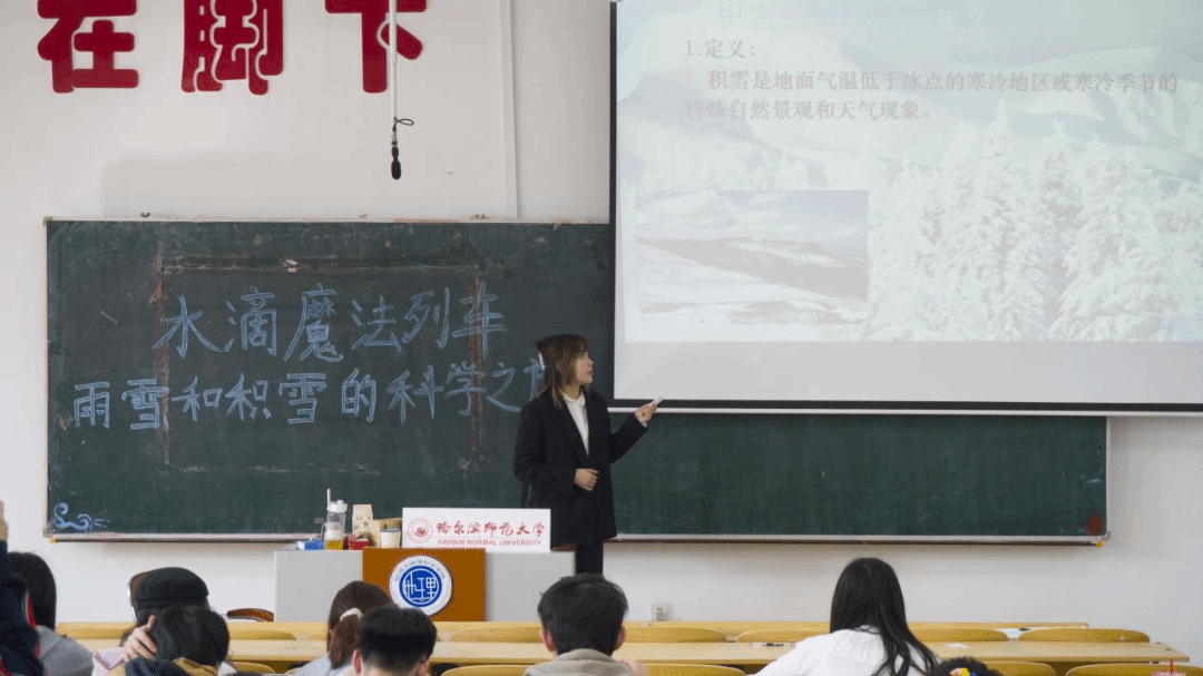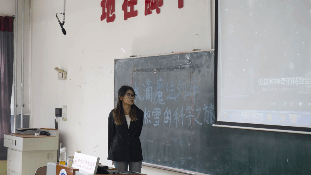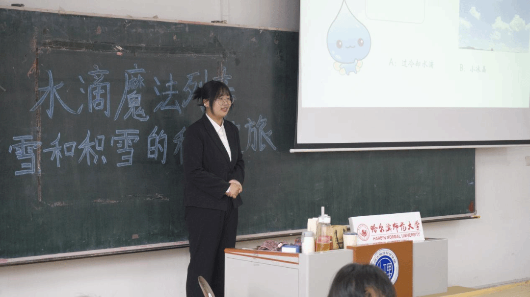 首先,马奕然同学运用情景教学模式,向同学们形象讲解了小水滴与雪的成长历程,并详细科普了风吹雪的危害和应对措施。