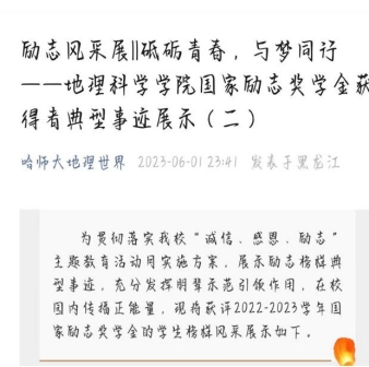 挖掘和宣传学院学生励志榜样典型,充分发挥朋辈示范引领作用。经过优中选优的评选方式,学院通过新媒体平台推送了6名获本年度国家励志奖学金优秀学生代表的事迹和榜样寄语,他们分别是张博群、姜可心、杨艳霞、代书源、冯雪、李玥。他们把自己砥砺奋斗的学习经验以文字的形式传输给大家,传播正能量,激励学院学生勤奋好学、自立自强、积极进取,引导学生自觉做社会主义核心价值观的坚定信仰者、积极传播者和模范践行者。