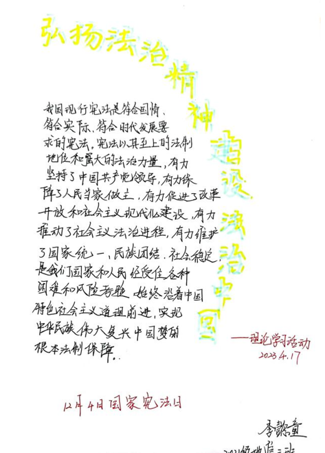 通过此次理论学习活动,我院青年更加深刻认识到作为新时代大学生应当把学法、尊法、守法、用法作为人生的必修课,培养法治观念,传递法治力量,紧跟党的步伐,建设法治中国!