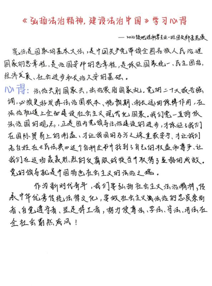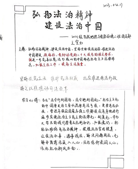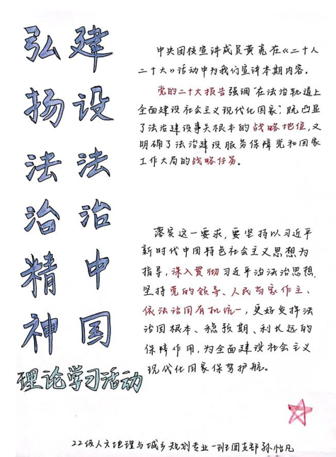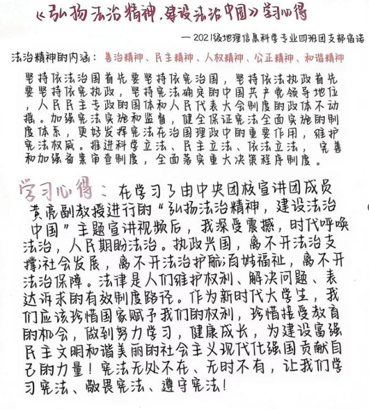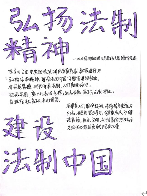 为深入学习贯彻党的二十大精神,贯彻落实中央、省委和学校党委KY.COM开展主题教育的部署要求,学习领会习近平新时代中国特色社会主义思想,全面落实《学校共青团2023年“基层组织建设年”工作方案》,切实加强理论武装,做好党的创新理论“青年化”阐释,地理科学学院团委特组织开展“赓续红色血脉·砥砺奋进力量”主题团支部政治理论学习活动,于4月20日19:00在理工三220室开展第二期《弘扬法治精神,建设法治中国》理论学习活动,2021级、2022级团支部委员会全体成员参加学习。