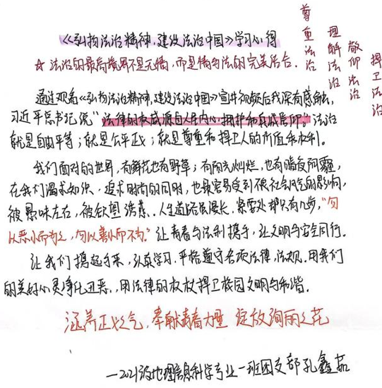 同学们观看了由中央团校宣讲团成员黄亮副教授讲授的《弘扬法治精神,建设法治中国》主题宣讲视频,从西周“明德慎罚”的法治思想,到现在“以人为本”的立法原则,法治无一不承载着人性的温暖。从民诉的“举证责任倒置”到刑诉的“未成年人不公开审理”,法治精神的核心内涵是正义性,法治的最高境界是情与法的完美结合,黄亮副教授详细地解读了建设法治中国的深刻意义。在学习过程中,同学们认真聆听、详细记录。通过本次学习,大家更加深刻地认识到作为祖国的未来、民族的希望,更应该知法、学法、懂法、用法、守法,维护宪法尊严和权威,提高个人素质,跟上法治建设的时代脚步,为中国梦绘下美好的蓝图!