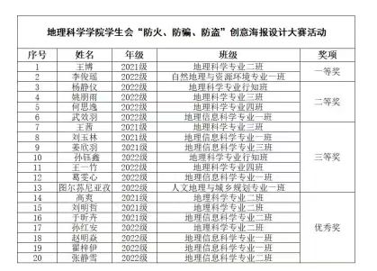 为响应国家构建高校安全稳定体系号召,切实保障学生的意识形态、生命财产和网络安全,加强防火、防骗、防盗安全教育普及,培养学生安全意识,丰富校园文化。地理科学学院学生会于2023年4月13日至4月23日组织开展“防火、防骗、防盗”为主题的线上创意海报设计大赛,2021级、2022级部分同学参赛。