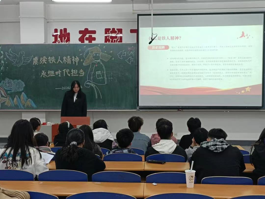 在参观完校园巡展后,各团支部举办了以“赓续铁人精神,承继时代担当”为主题的团日活动。在团日活动中,各班主讲人带领班级同学了解铁人故事,深刻挖掘铁人精神的丰富内涵,并结合现实说明铁人精神的意义。通过详细的PPT讲解、生动的情景剧演绎、铁人精神演讲、击鼓传花等多种形式引导大家积极参与,深刻理解铁人精神,让大家懂得作为新时代青年要大力传承弘扬铁人精神,始终保持爱国情怀、践行求实奉献的行动、稳扎稳打、善作善成,把宝贵的精神财富传承好、弘扬好,用实践赋予铁人精神更多新内涵,让其穿越时空熠熠生辉。