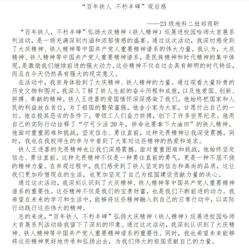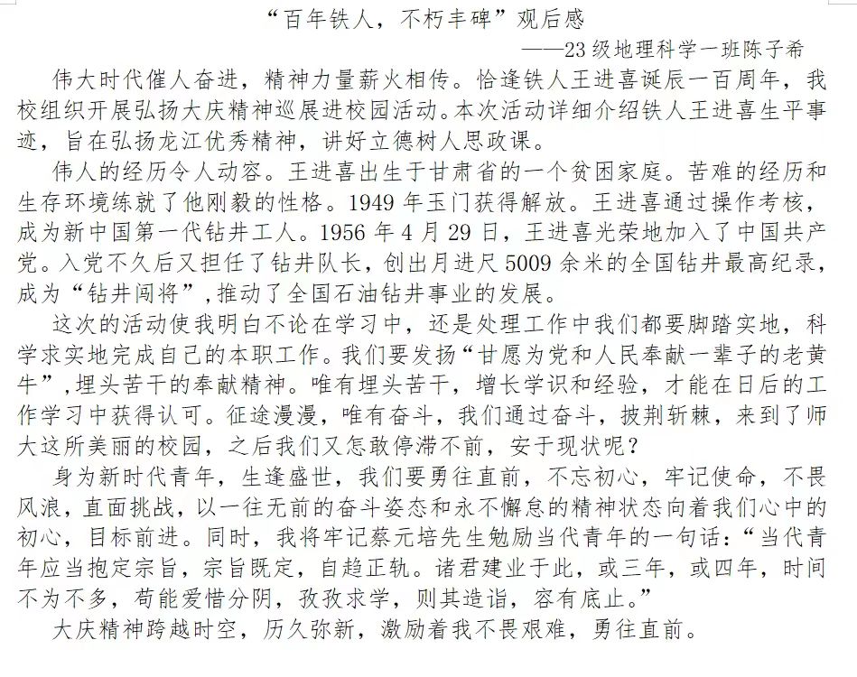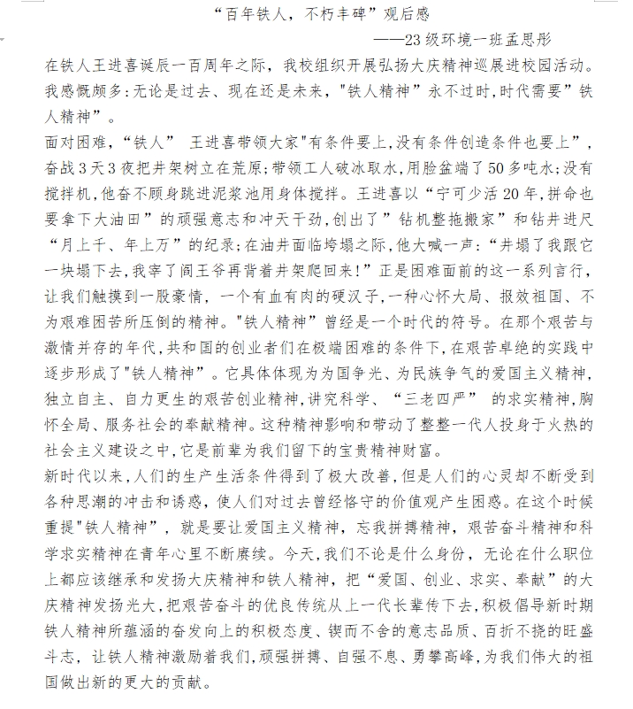 通过此次系列活动,同学们回首过去那段艰苦岁月,充分感受到了工人阶级的无畏精神和“我为祖国献石油”的家国情怀,对铁人精神有了深刻的感悟,以文字写下心声,以青春传承铁人精神。