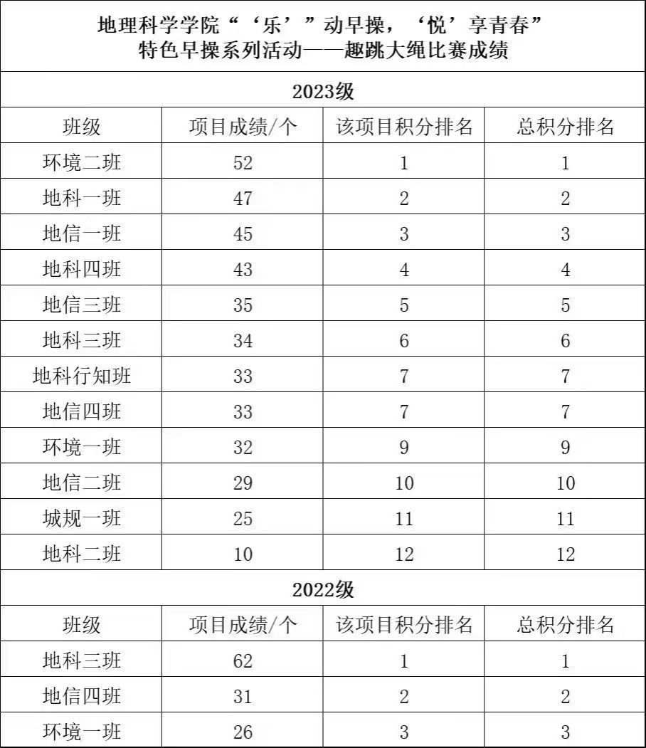 “‘乐’动早操,‘悦’享青春”特色早操系列活动——趣跳大绳比赛成绩如下表: