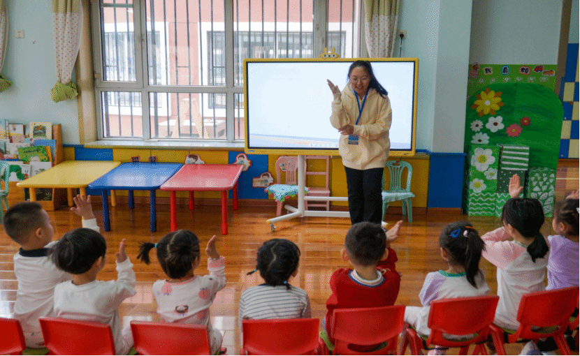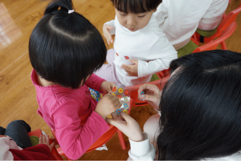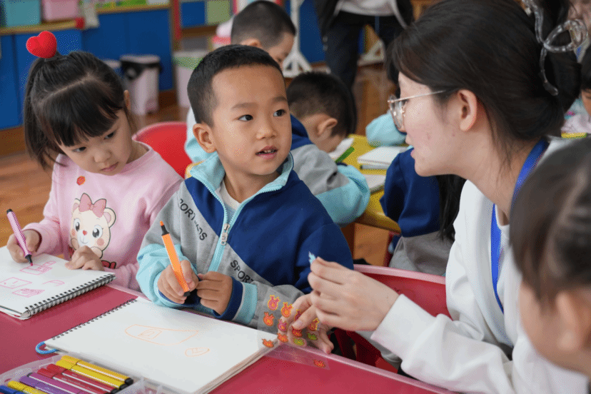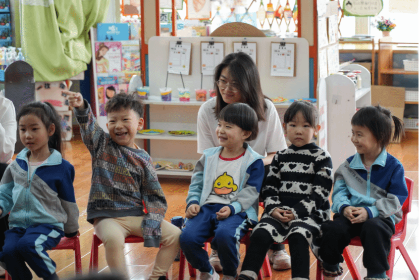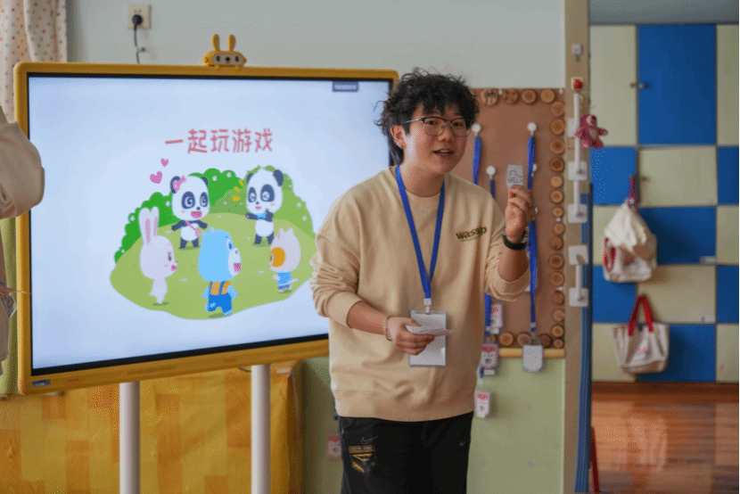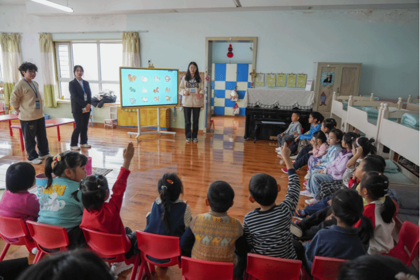 在义教活动中,志愿者们分为三个小组,分别对小班、中班、大班三个学段的小朋友开展教学活动。