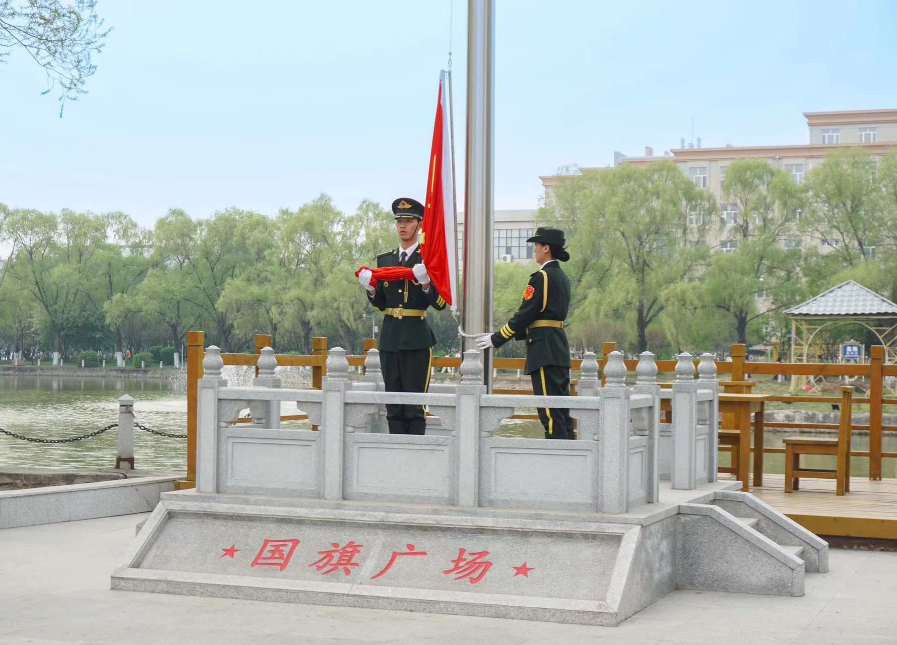 清晨七时,英姿飒爽的国旗护卫队身着整齐的戎装,迈着整齐的步伐护送五星红旗走向国旗台。随着雄壮激昂的《义勇军进行曲》奏响,鲜艳的五星红旗冉冉升起,全体师生肃立,怀着对祖国的热爱和崇高的敬意,向国旗行注目礼,高声齐唱国歌。