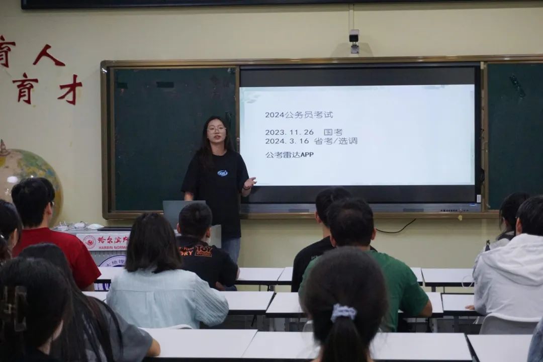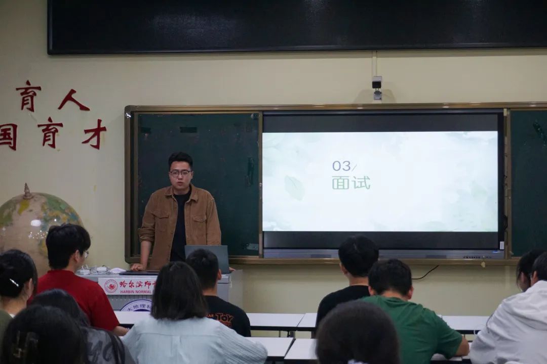 2020级地理信息科学专业一班苗伟宁,补充了薛景文学姐的介绍内容。他强调了面试正能量、计划组织协调、人际关系应急处理等方面的问题,介绍了线上线下课的区别,详细介绍了事业编的相关内容,并以例题的形式对职测、综应进行详细介绍。最后,他强调了要脚踏实地,认真走完每一步。